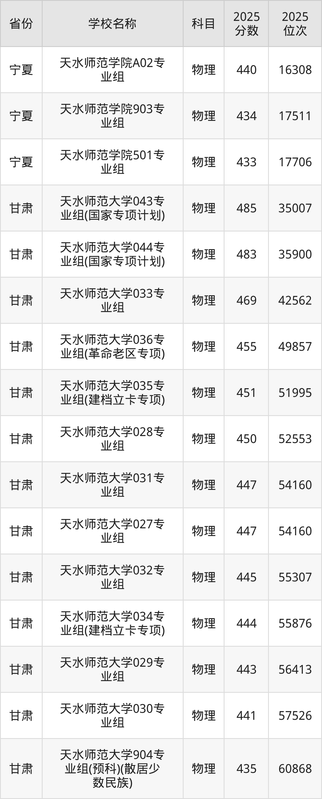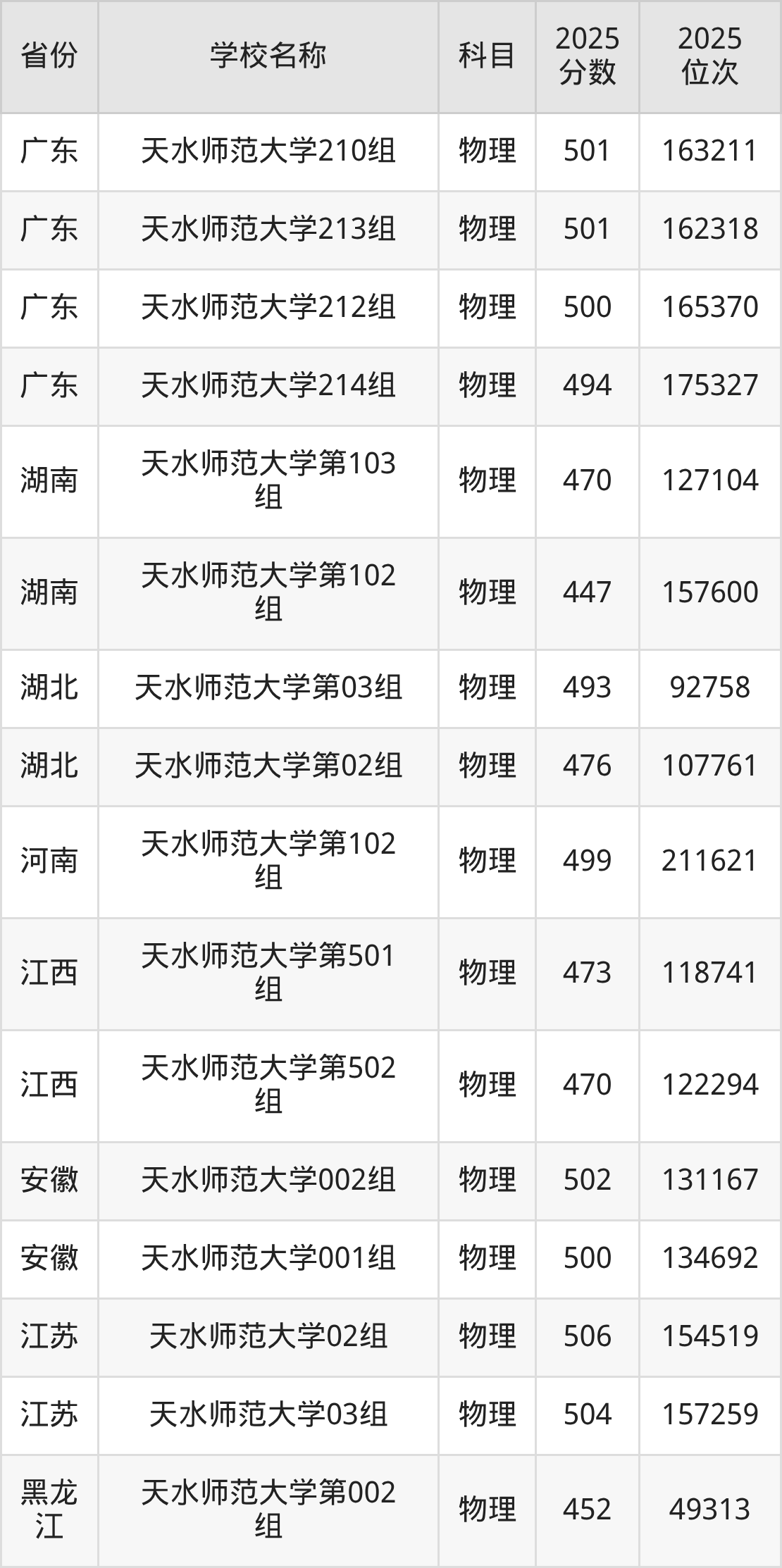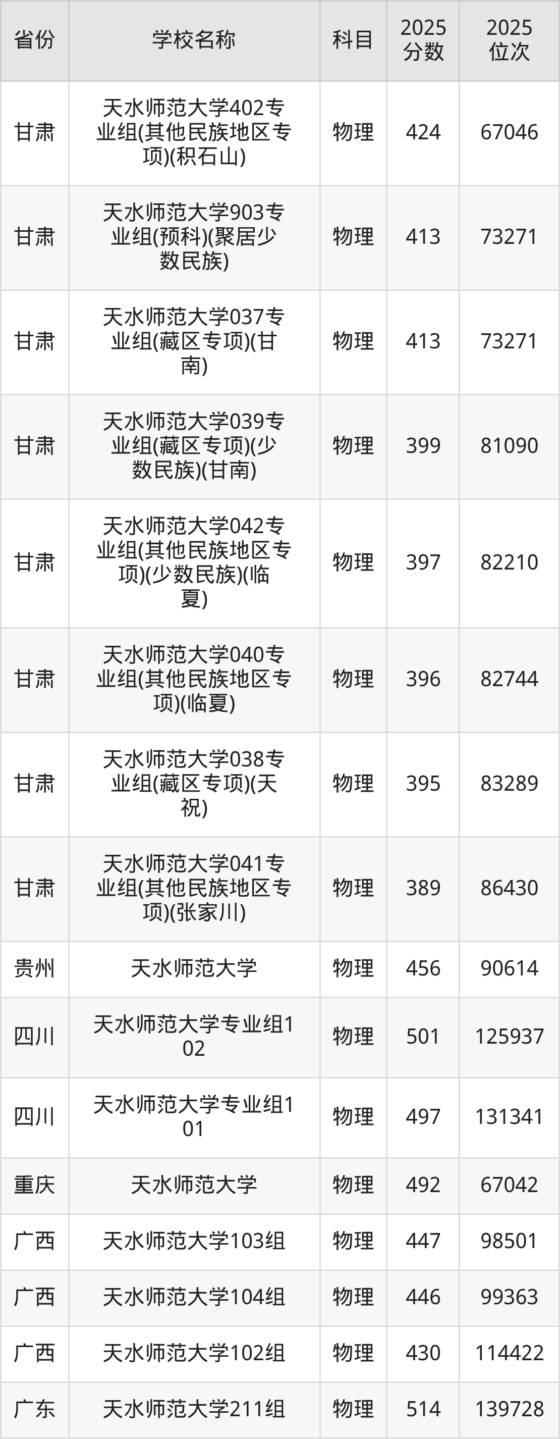 天水师范大学2025年有27个专业组面向甘肃省内首选了物理科目的考生招生: