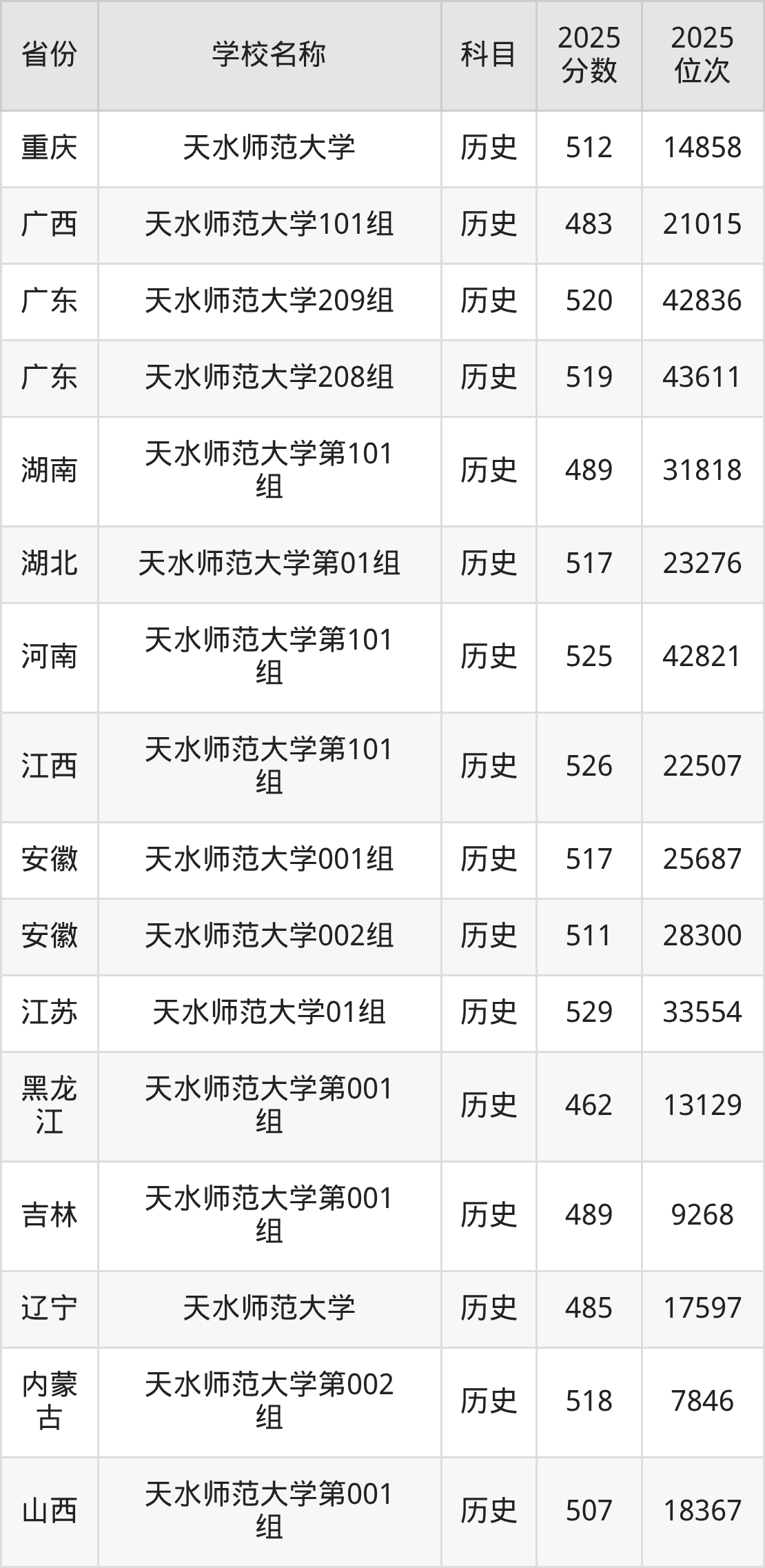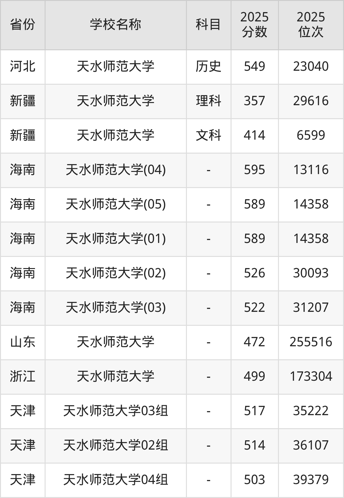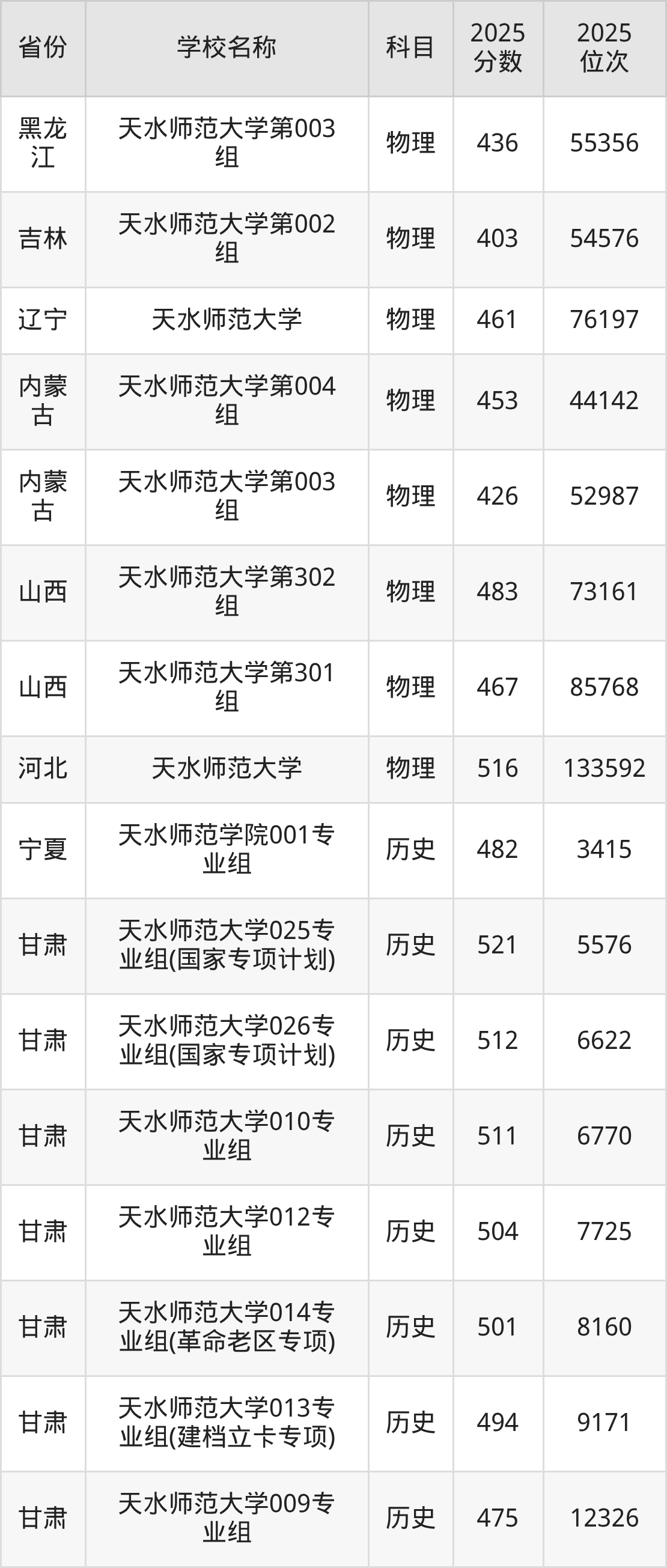 再看甘肃高考2025年本科批次线,历史类是412分、物理类是374分。通过对比发现:天水师范大学2025年历史类最低分比本科线低38分,物理类最低分比本科线高15分。2026届甘肃高考生,可通过每一次模考划线,来判断自己的成绩是否有机会被天水师范大学录取。
