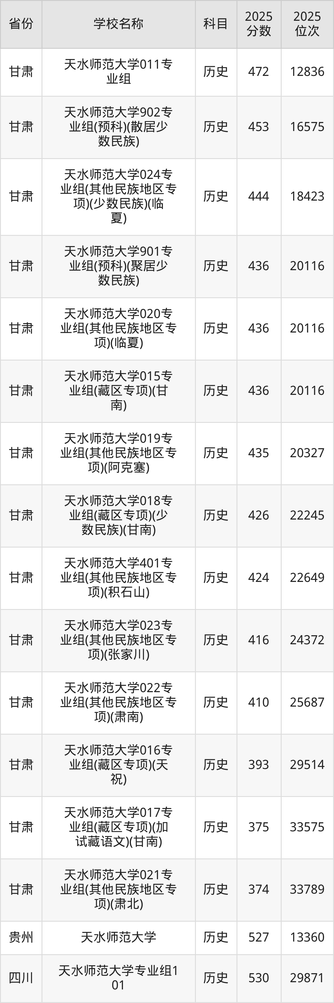 天水师范大学2025年有26个专业组面向甘肃省内首选了历史科目的考生招生: