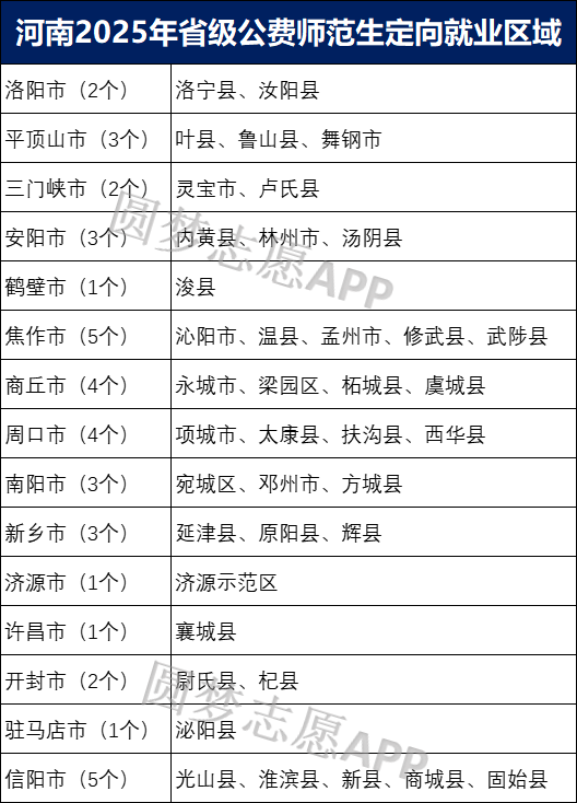 以下为2025年河南省级公费师范生定向就业县区整理,供考生提前了解履约去向: