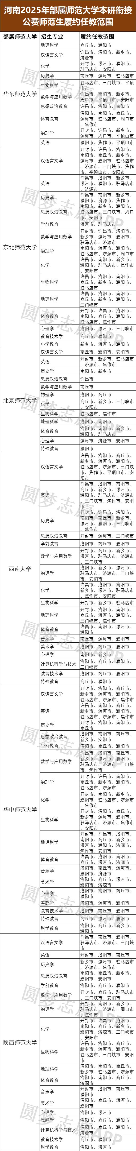 以下为2025年部分部属师范大学公费师范生在河南的履约任教范围整理,2026届考生可在专业选择时重点参考。