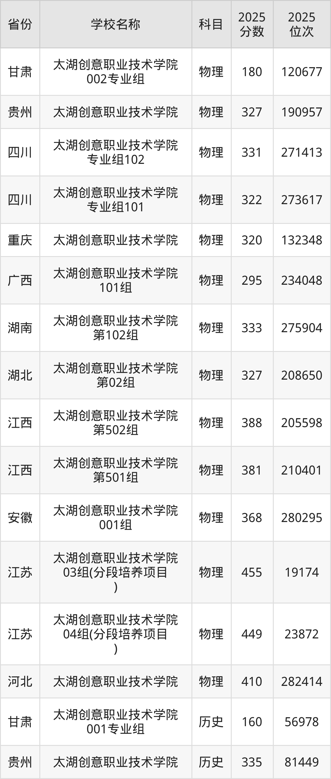 2025年太湖创意职业技术学院在全国各省专科的最低录取分数线在160~482分之间。江苏物理类高考生最低455分能上太湖创意职业技术学院、河北物理类高考生最低410分能上太湖创意职业技术学院……下文将展示太湖创意职业技术学院在全国14个高考省份中的专科最低投档录取分汇总!