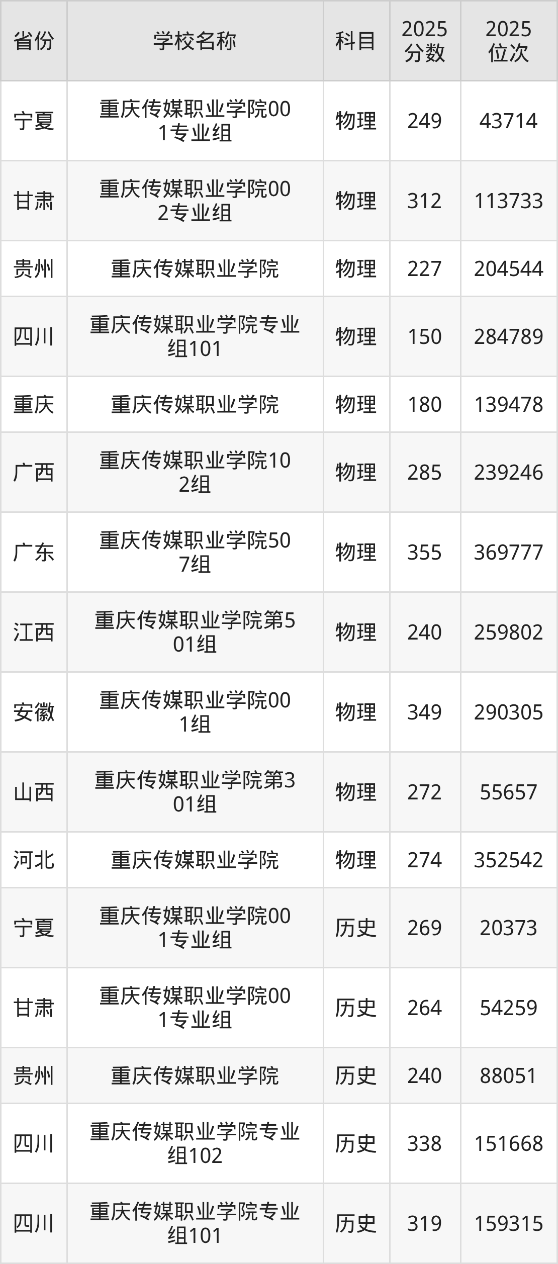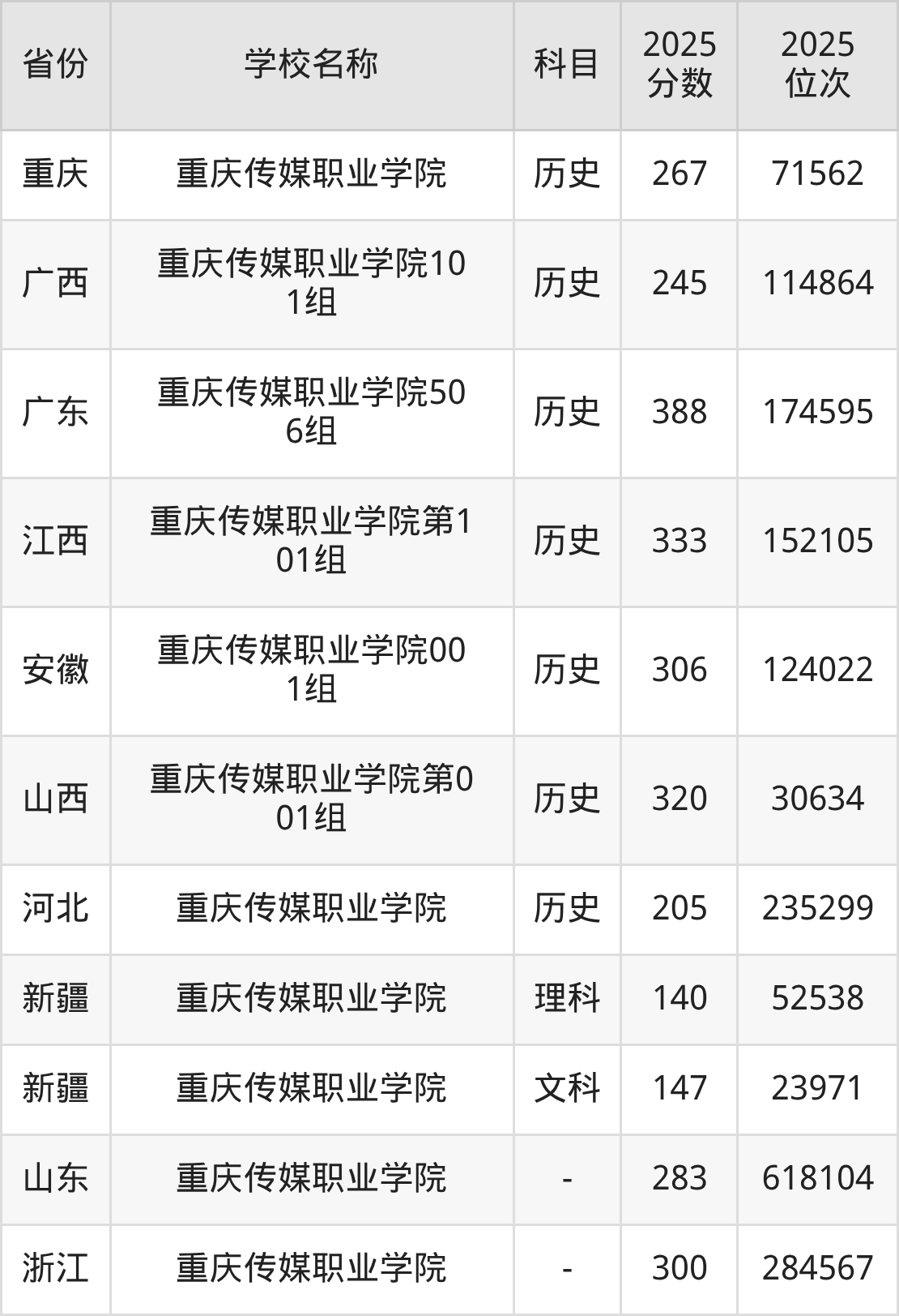 2025年重庆传媒职业学院在全国各省专科的最低录取分数线在140~388分之间。广东物理类高考生最低355分能上重庆传媒职业学院、安徽物理类高考生最低349分能上重庆传媒职业学院……下文将展示重庆传媒职业学院在全国14个高考省份中的专科最低投档录取分汇总!