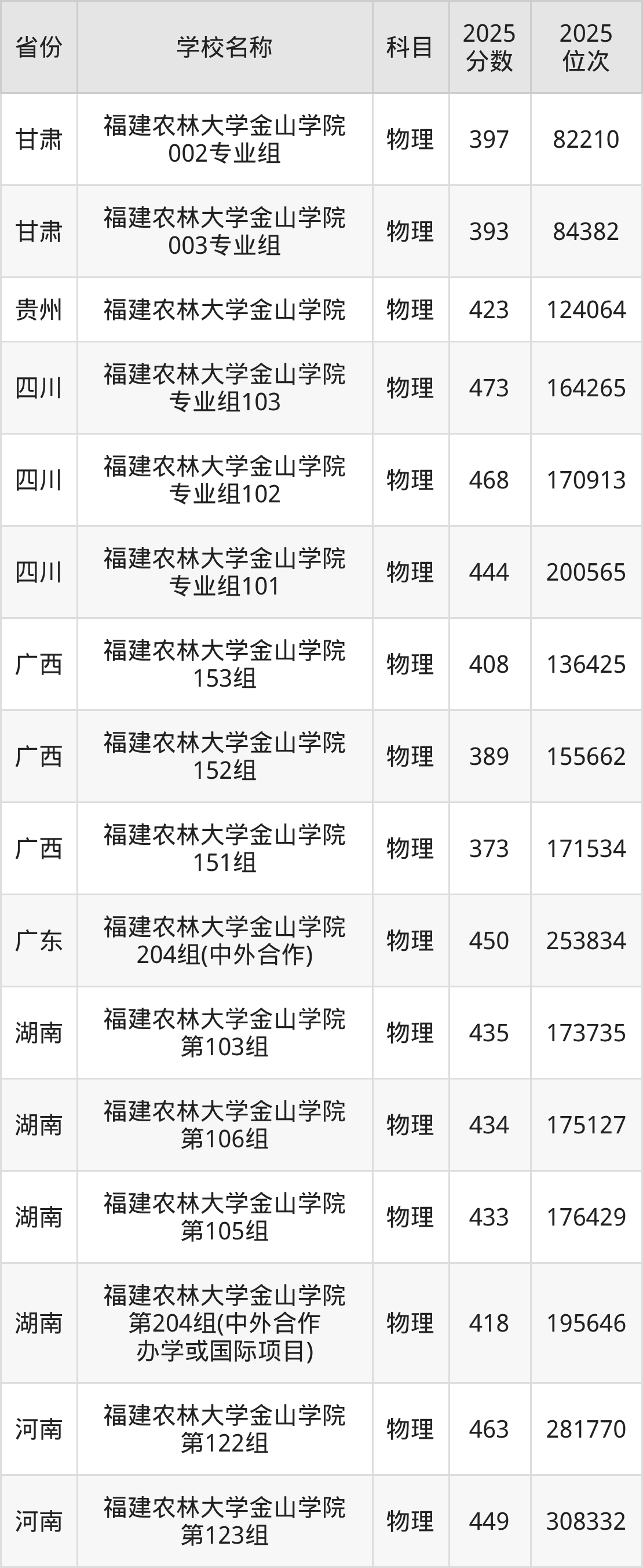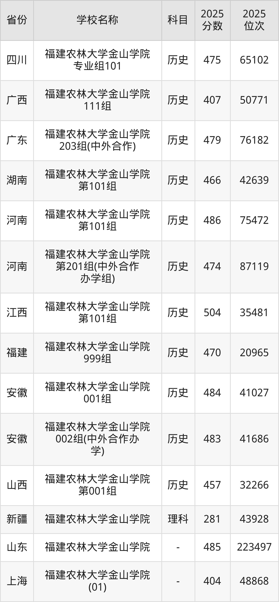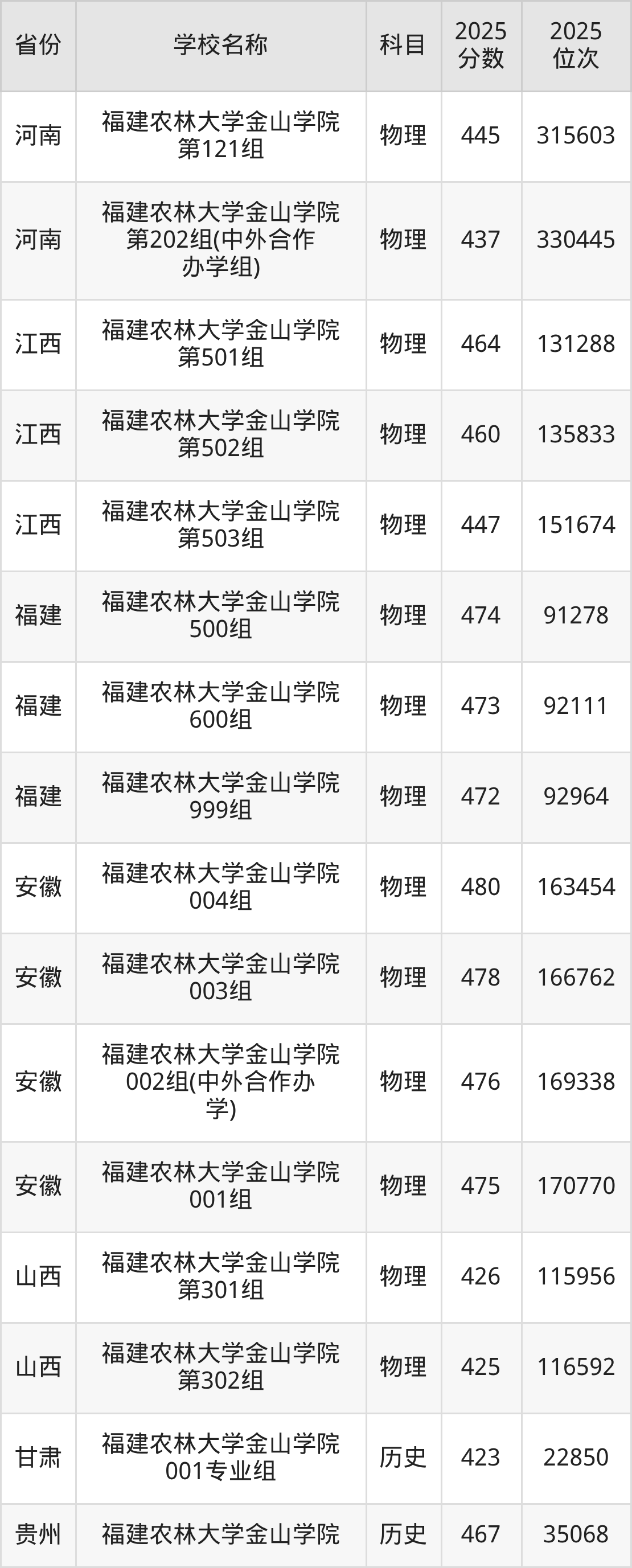 二、福建农林大学金山学院各专业录取分数线