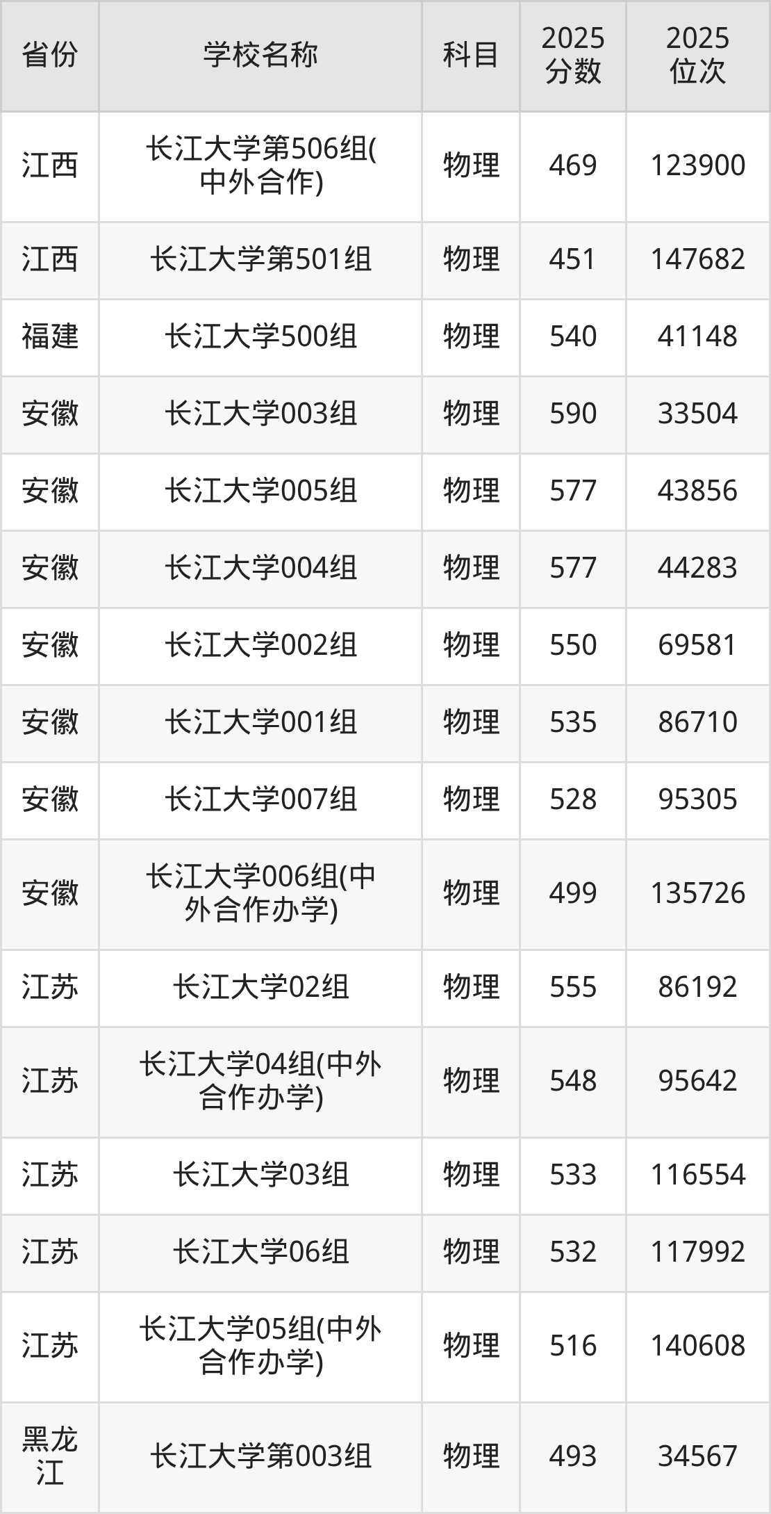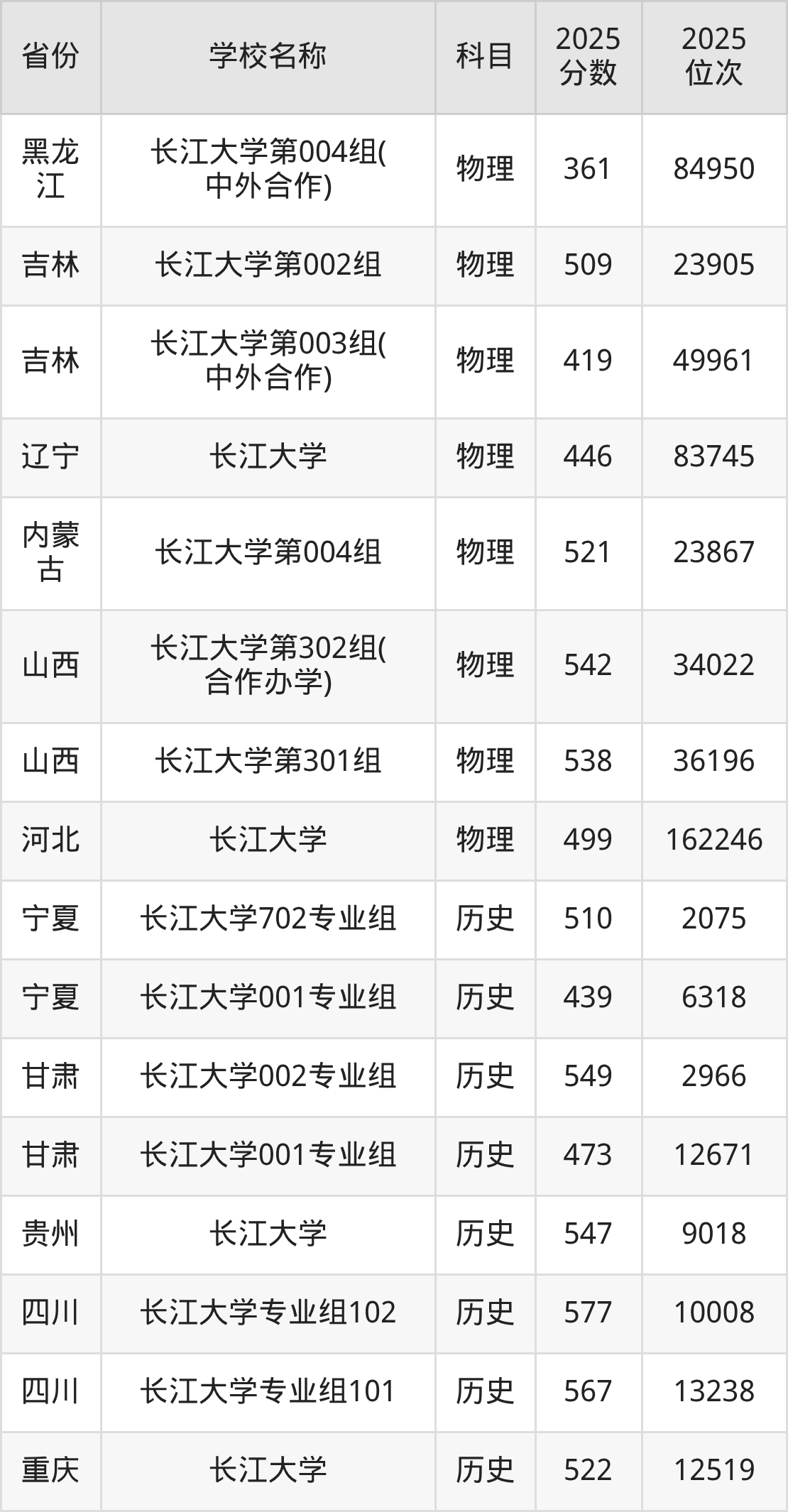 二、长江大学各专业录取分数线