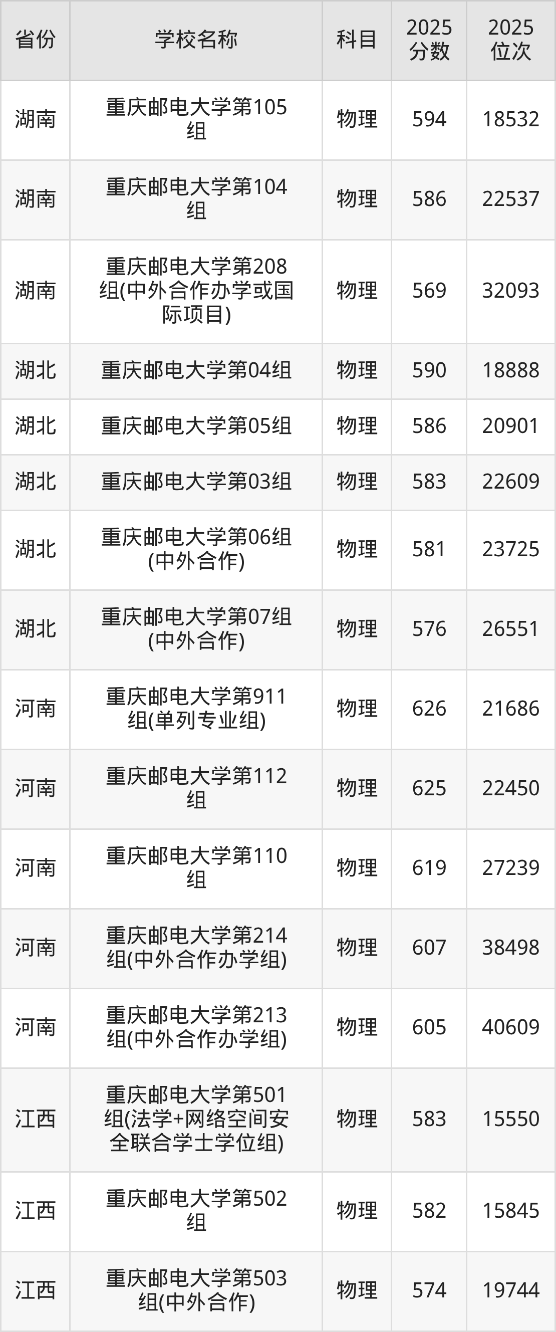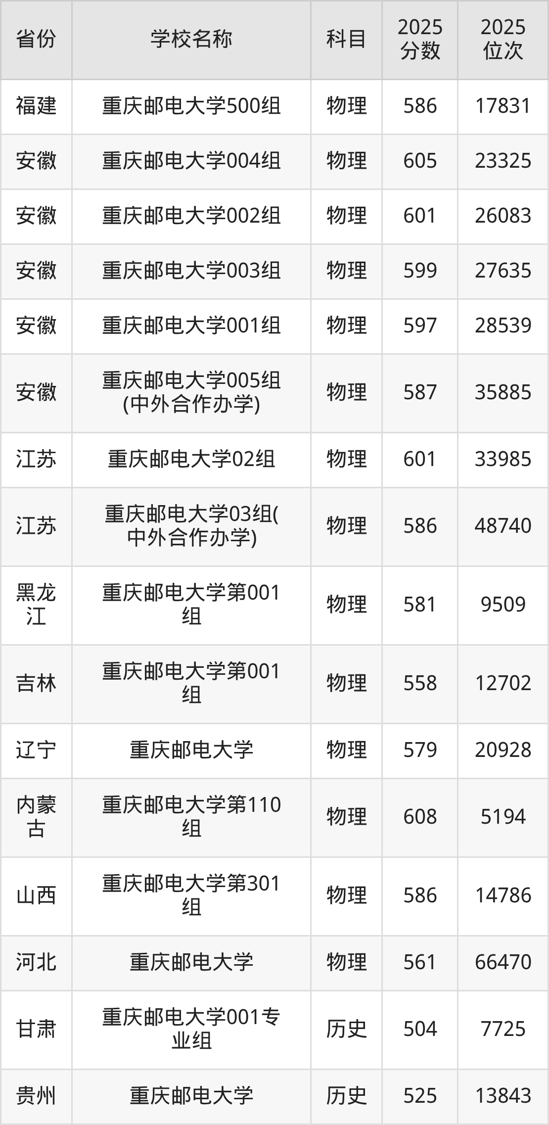 二、重庆邮电大学各专业录取分数线