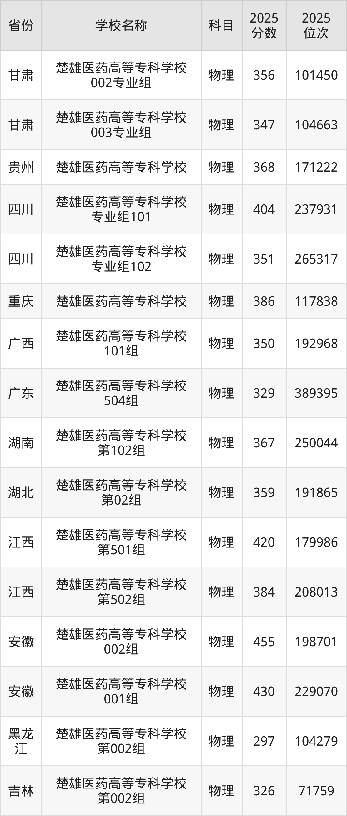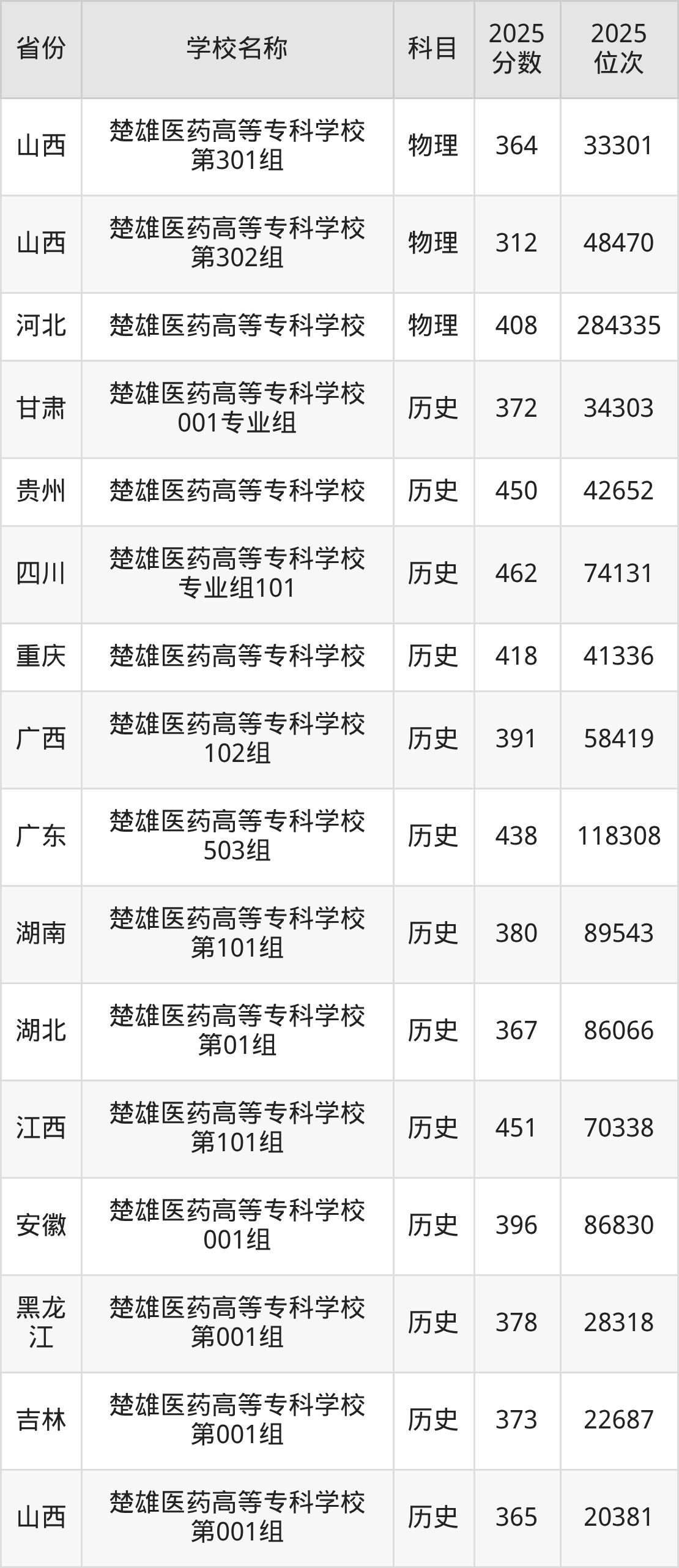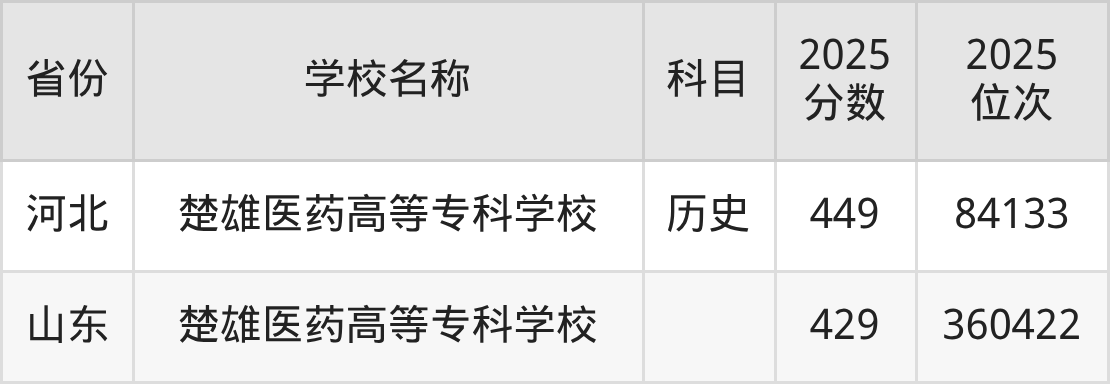 一、2025楚雄医药高等专科学校录取分数线
