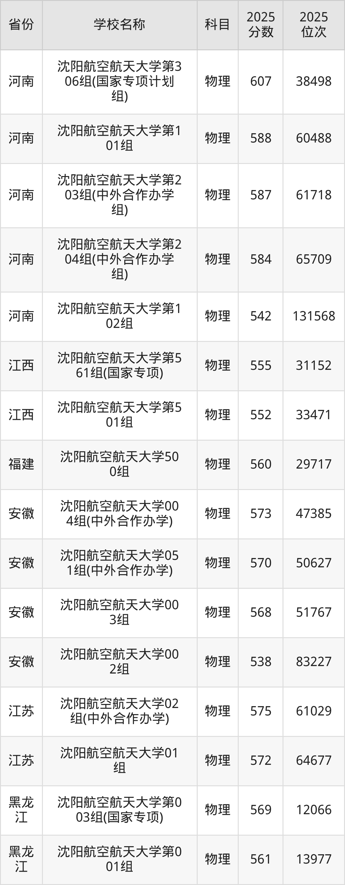 二、沈阳航空航天大学各专业录取分数线