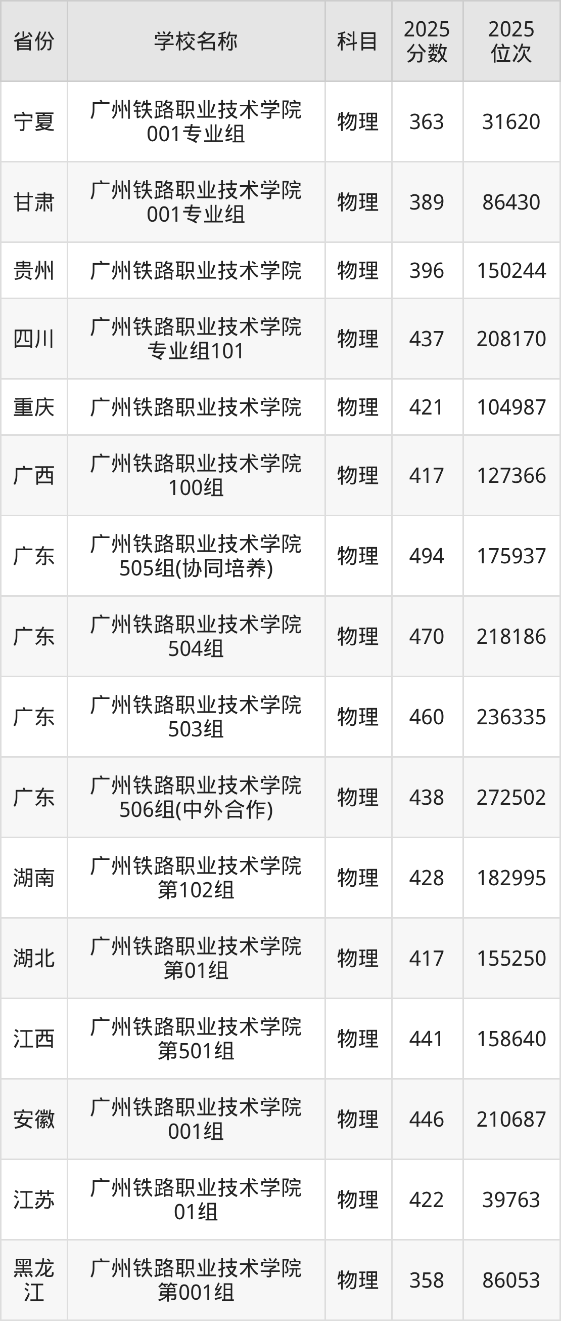 广州铁路职业技术学院2025年有4个专业组面向广东省内首选了物理科目的考生招生: