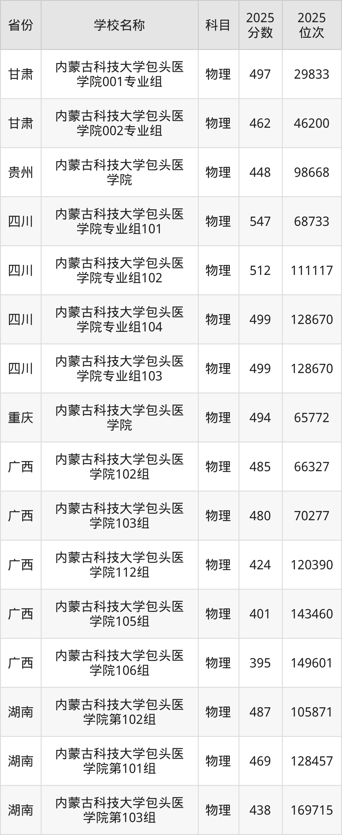 内蒙古科技大学包头医学院2025年有15个专业组面向内蒙古自治区内首选了物理科目的考生招生:
