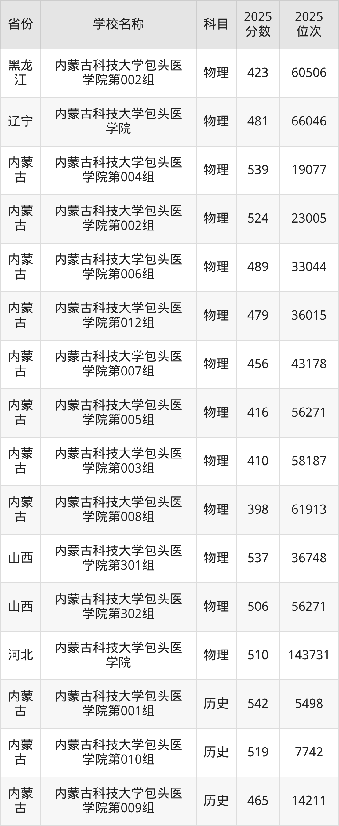 二、内蒙古科技大学包头医学院各专业录取分数线