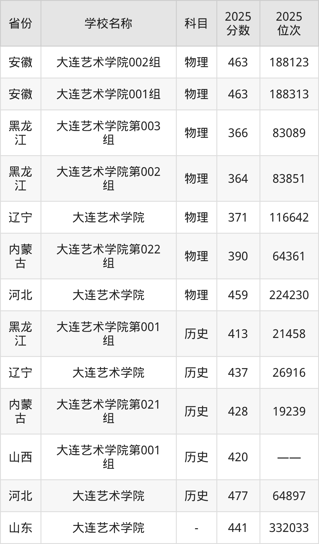 2025年大连艺术学院在全国各省本科的最低录取分数线在364~477分之间。安徽物理类高考生最低463分能上大连艺术学院、河北物理类高考生最低459分能上大连艺术学院……下文将展示大连艺术学院在全国7个高考省份中的本科最低投档录取分汇总!