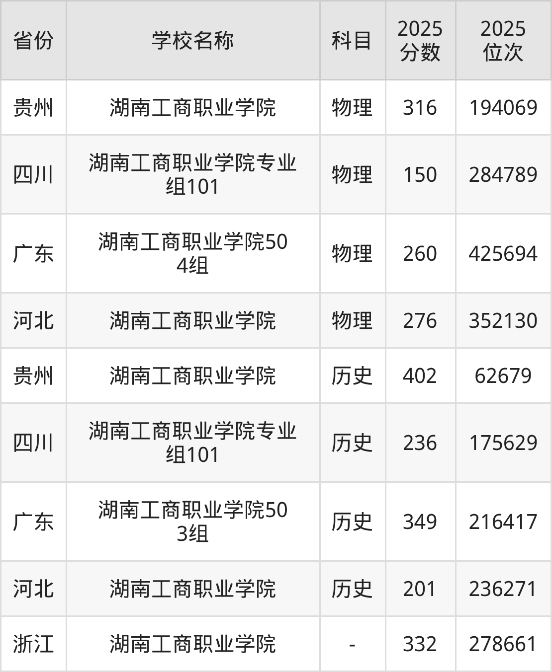 2025年湖南工商职业学院在全国各省专科的最低录取分数线在150~402分之间。浙江高考生最低332分能上湖南工商职业学院、贵州物理类高考生最低316分能上湖南工商职业学院……下文将展示湖南工商职业学院在全国5个高考省份中的专科最低投档录取分汇总!