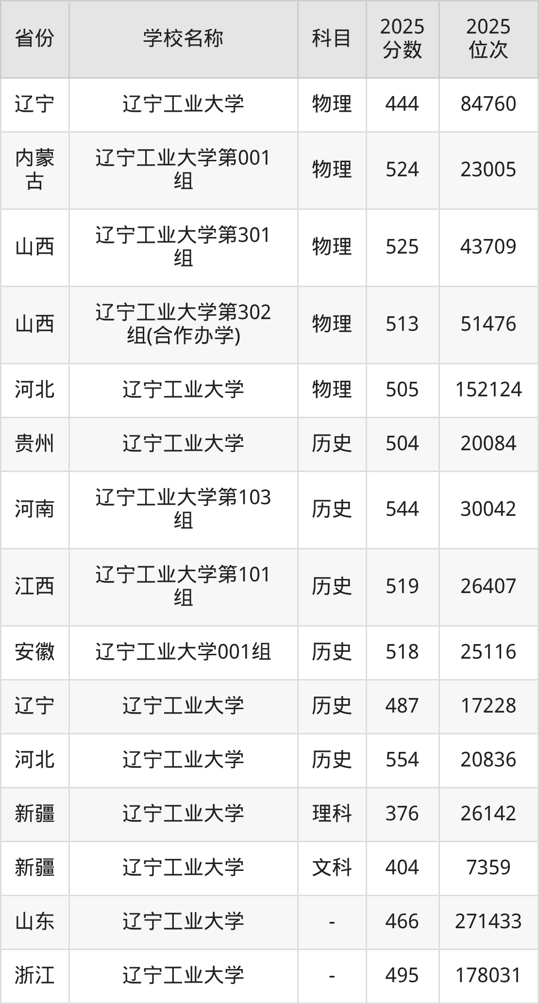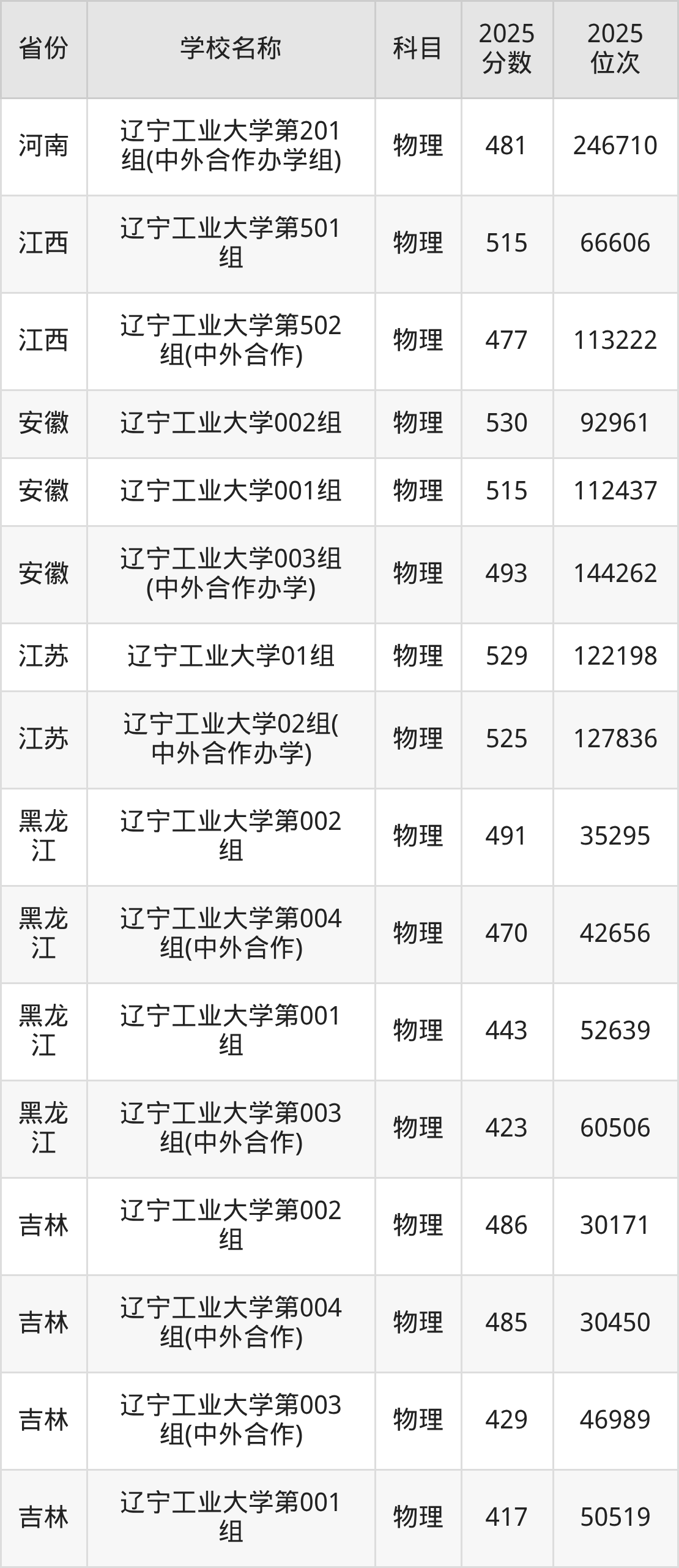 二、辽宁工业大学各专业录取分数线