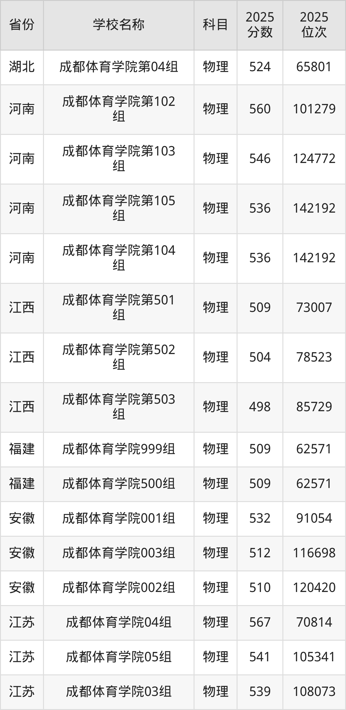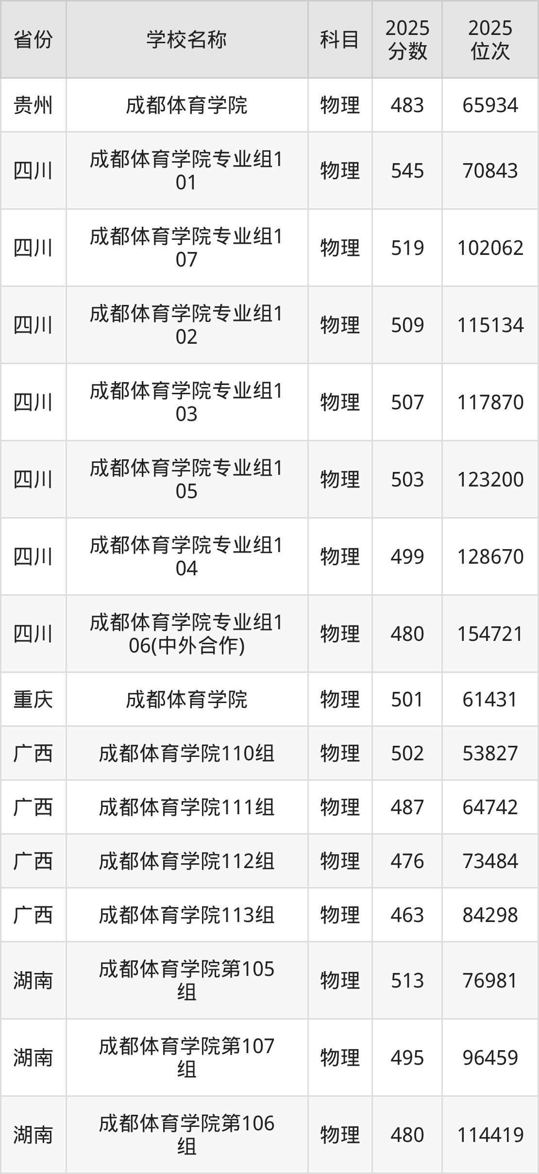 成都体育学院2025年有7个专业组面向四川省内首选了物理科目的考生招生: