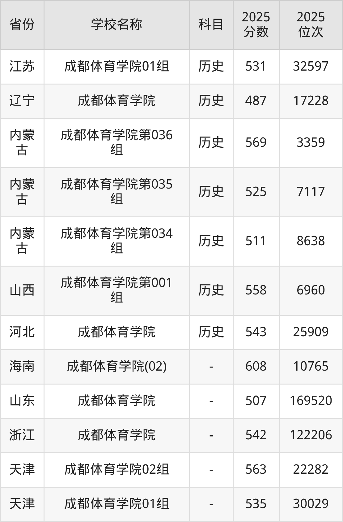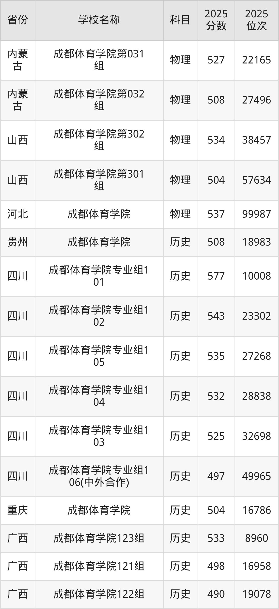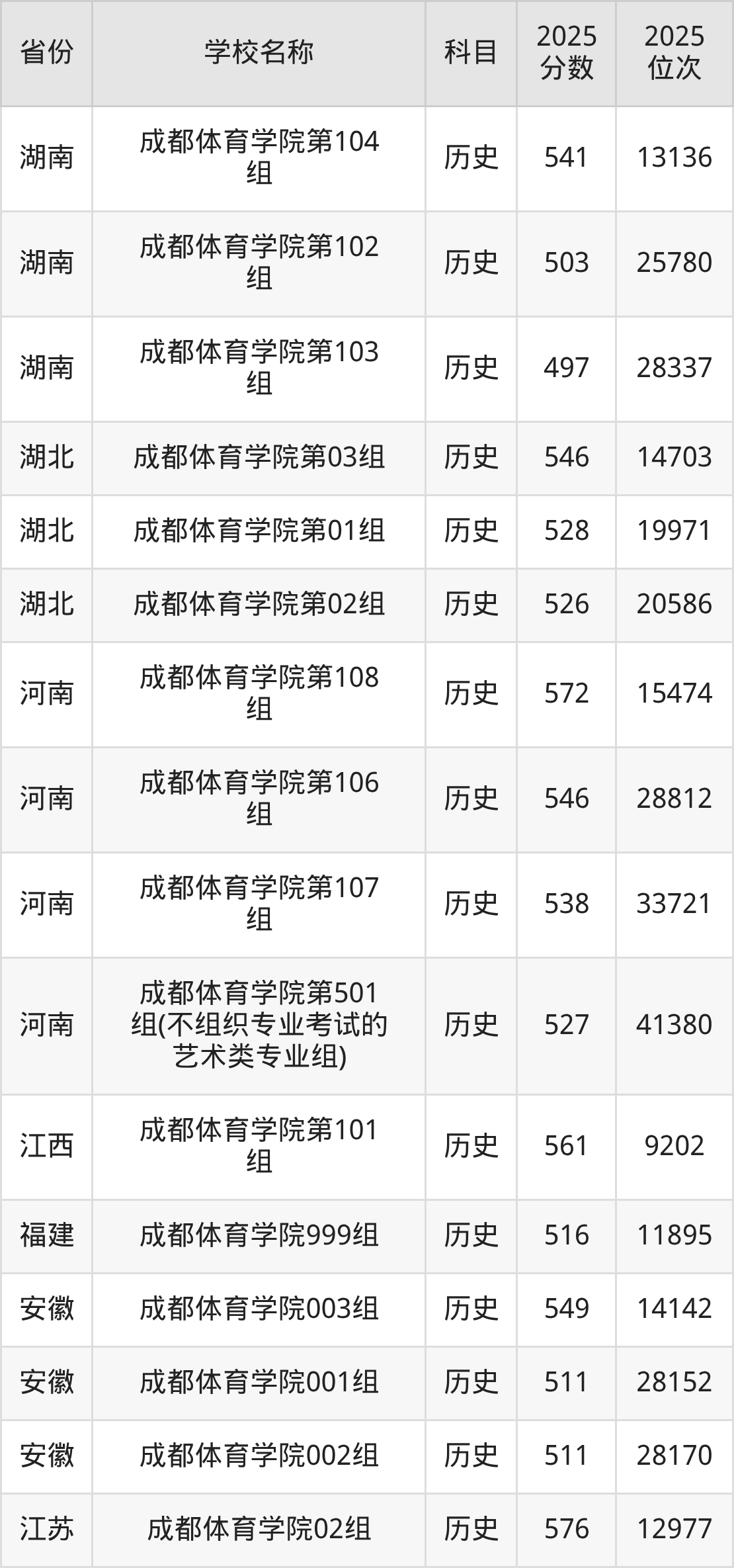 成都体育学院2025年有6个专业组面向四川省内首选了历史科目的考生招生:
