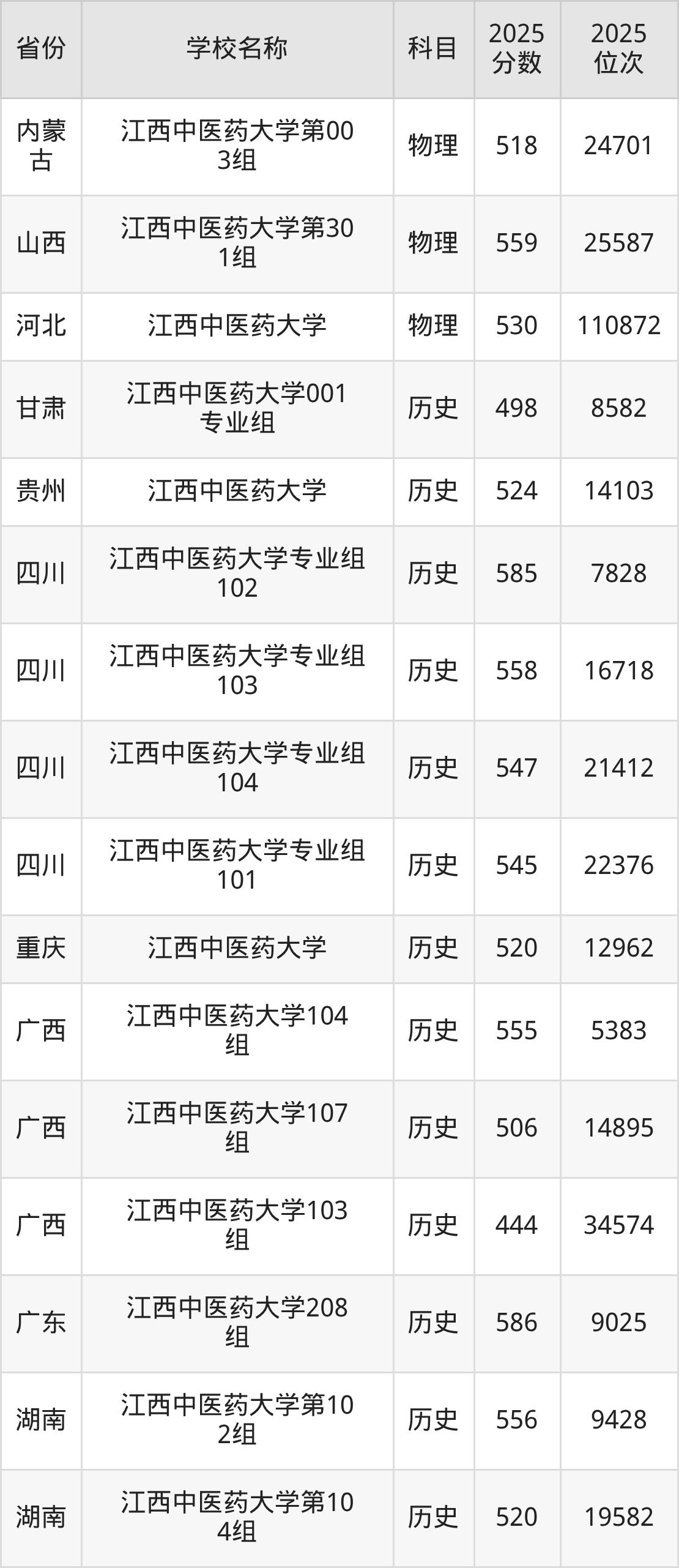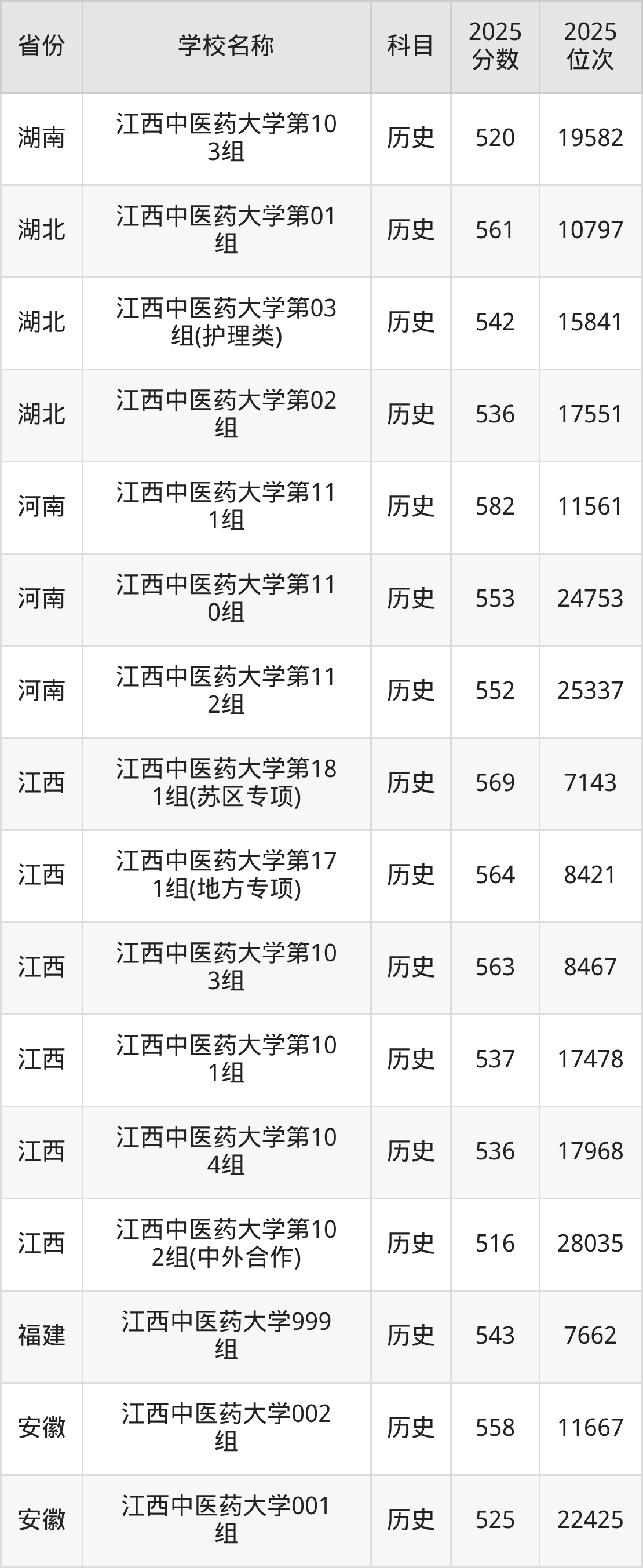 江西中医药大学2025年有6个专业组面向江西省内首选了历史科目的考生招生: