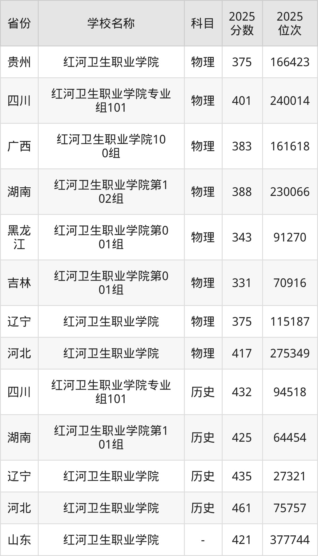 2025年红河卫生职业学院在全国各省专科的最低录取分数线在331~461分之间。山东高考生最低421分能上红河卫生职业学院、河北物理类高考生最低417分能上红河卫生职业学院……下文将展示红河卫生职业学院在全国9个高考省份中的专科最低投档录取分汇总!