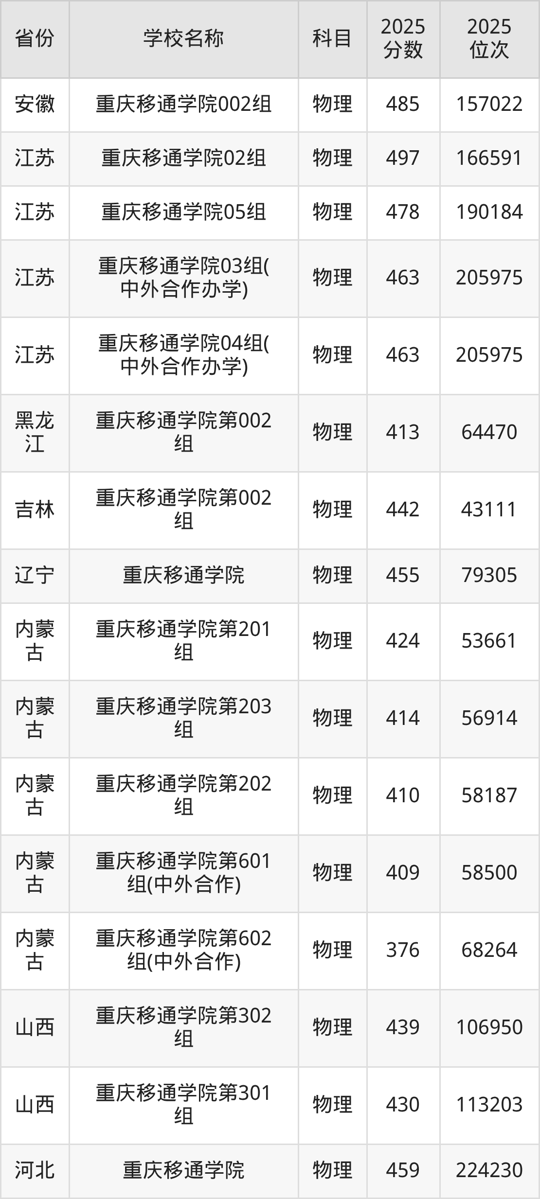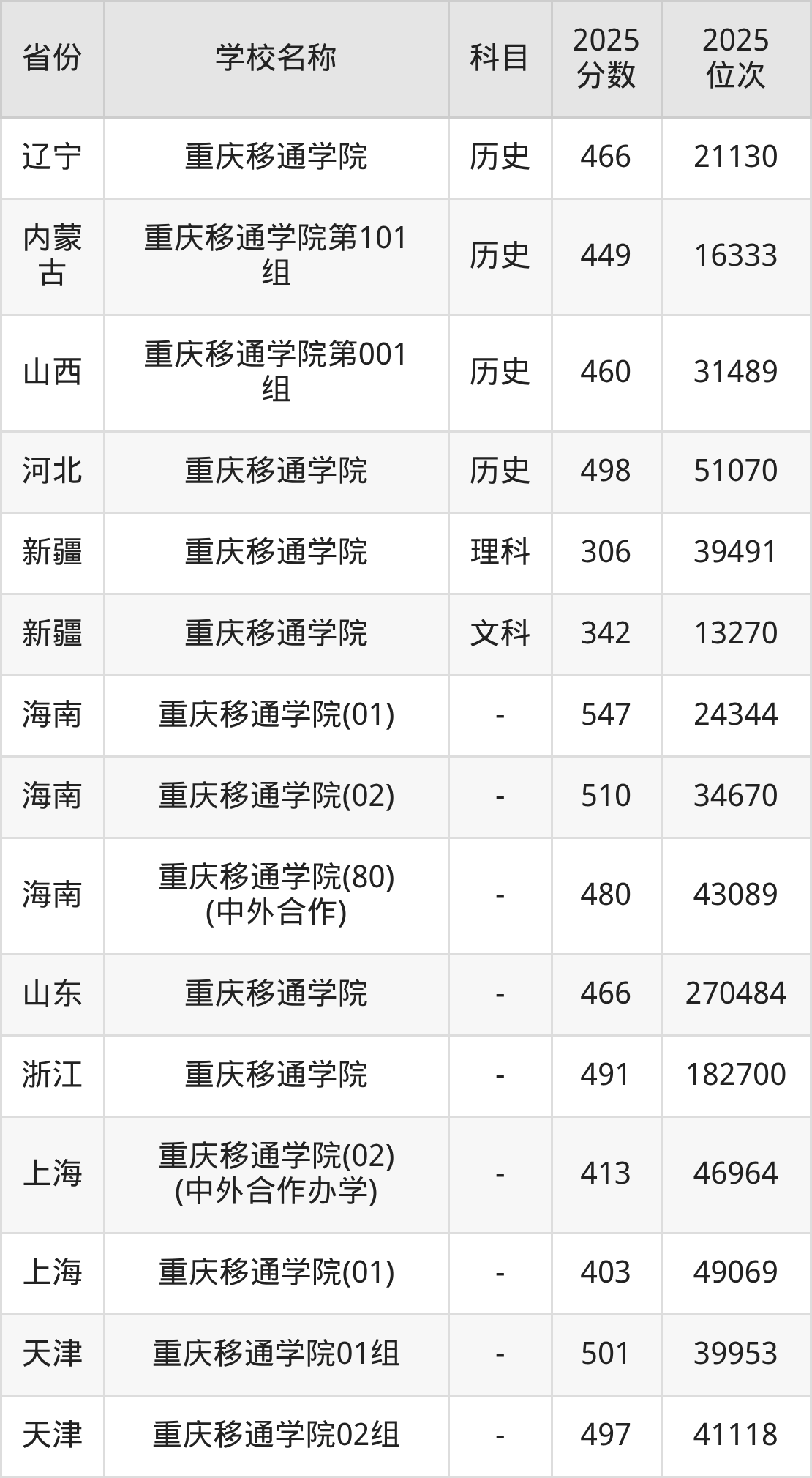 2025年重庆移通学院在全国各省本科的最低录取分数线在306~547分之间。海南高考生最低547分能上重庆移通学院、天津高考生最低501分能上重庆移通学院……下文将展示重庆移通学院在全国26个高考省份中的本科最低投档录取分汇总!