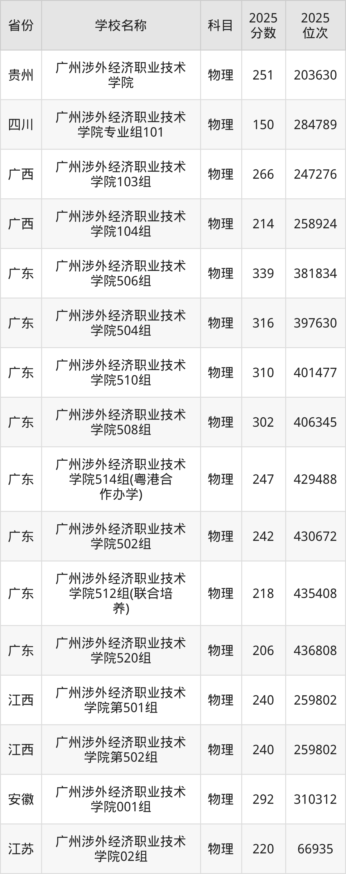 广州涉外经济职业技术学院2025年有8个专业组面向广东省内首选了物理科目的考生招生: