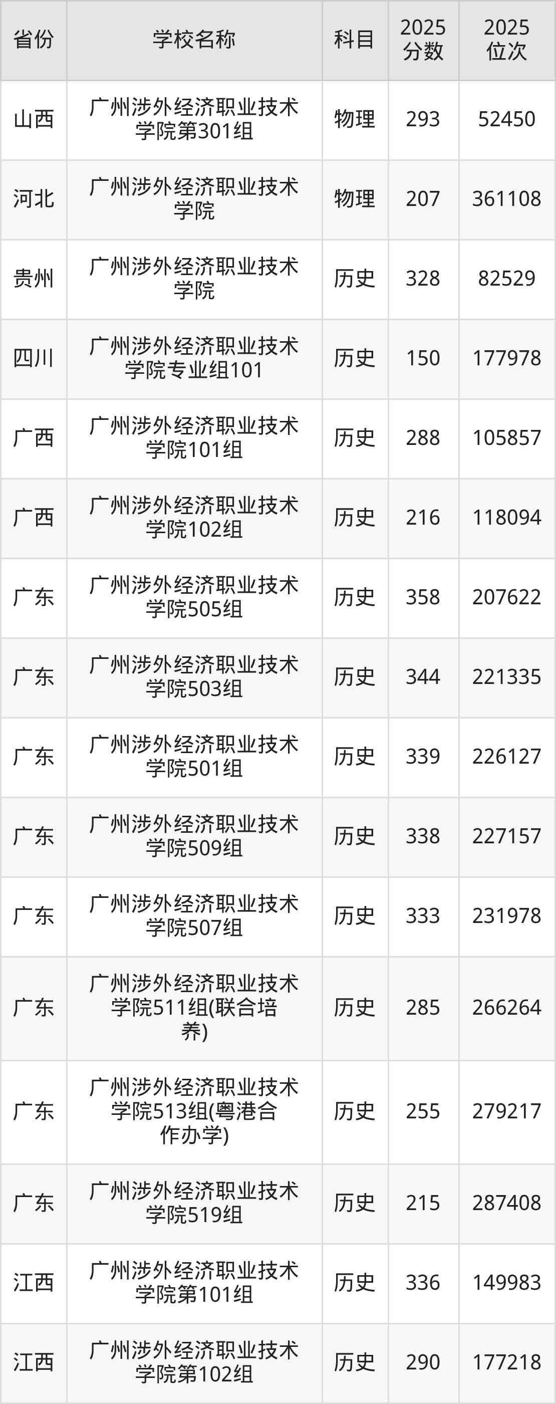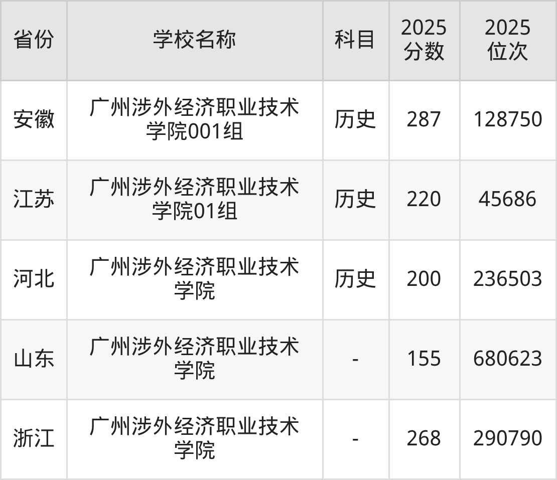 再看广东高考2025年专科批次线,历史类是215分、物理类是200分。通过对比发现:广州涉外经济职业技术学院2025年历史类最低分与专科线相等,物理类最低分比专科线高6分。2026届广东高考生,可通过每一次模考划线,来判断自己的成绩是否有机会被广州涉外经济职业技术学院录取。