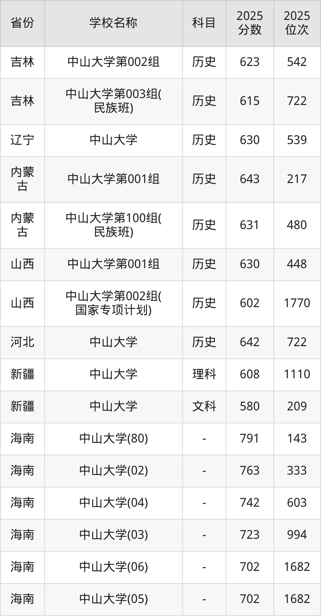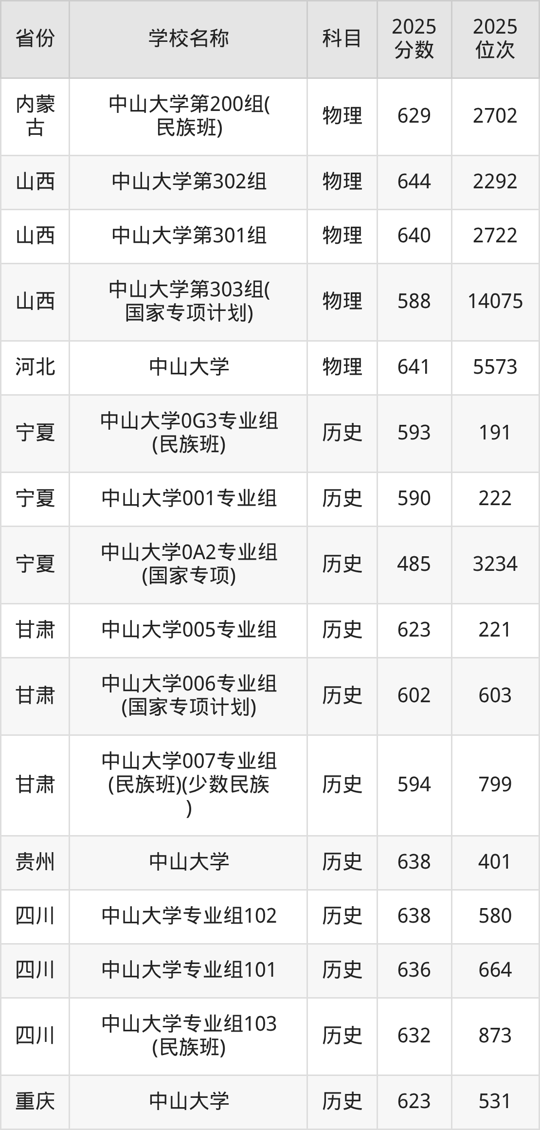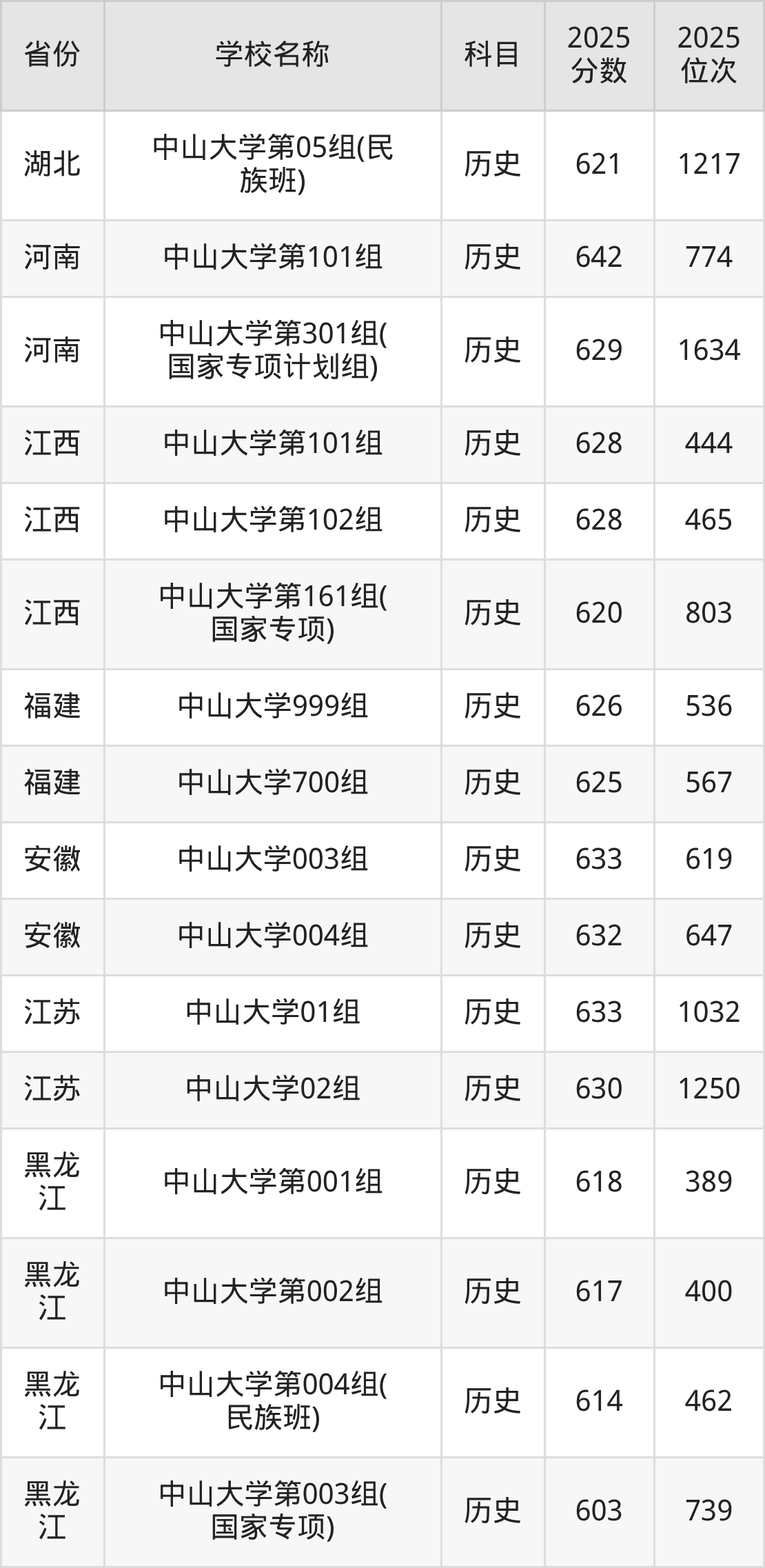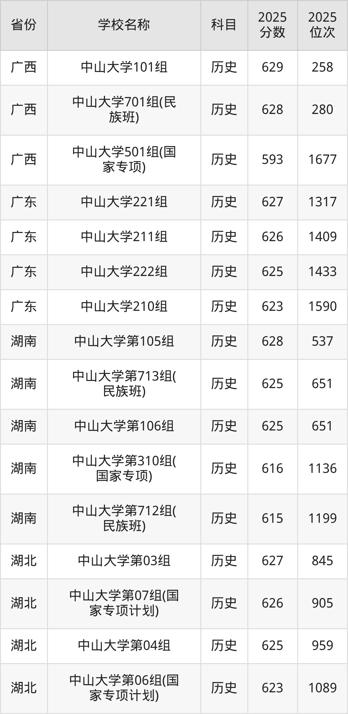 中山大学2025年有5个专业组面向广东省内首选了历史科目的考生招生: