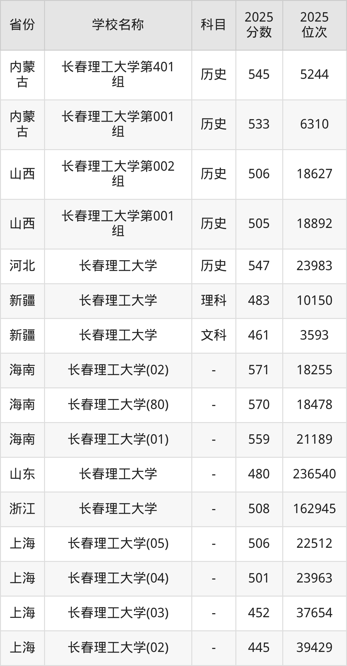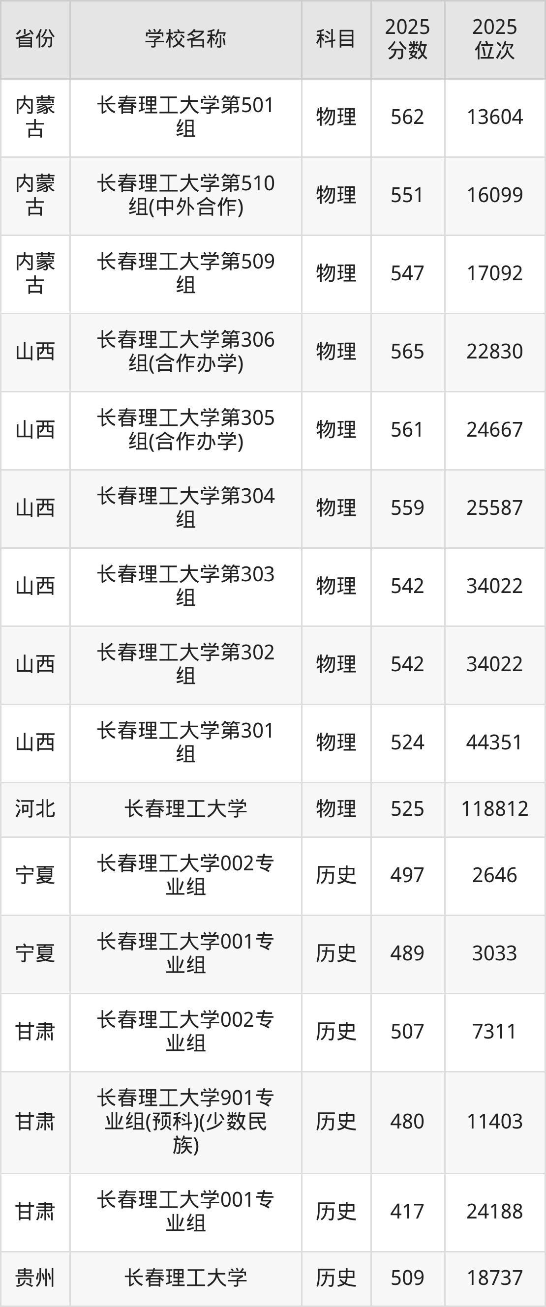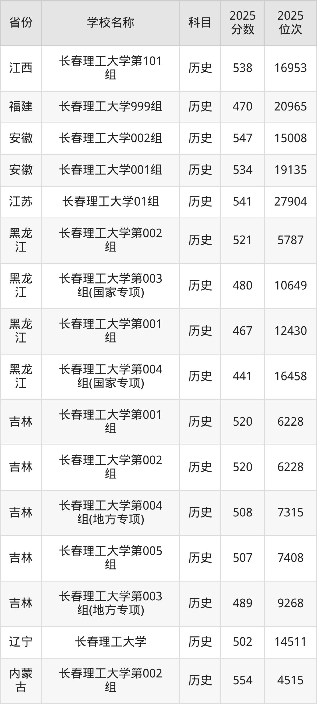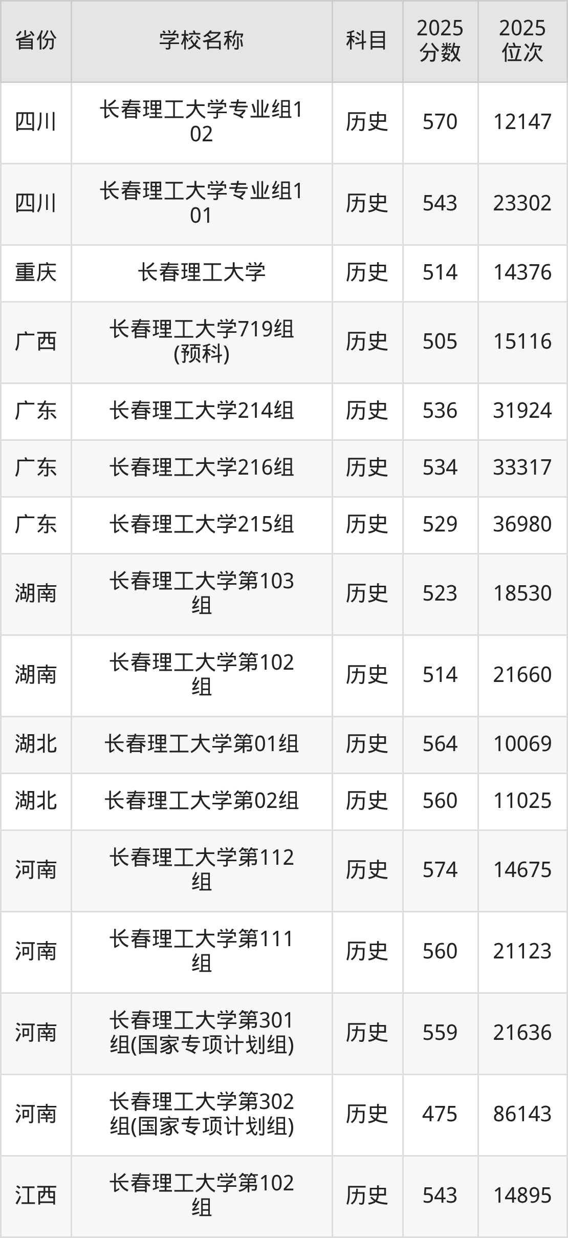 长春理工大学2025年有5个专业组面向吉林省内首选了历史科目的考生招生: