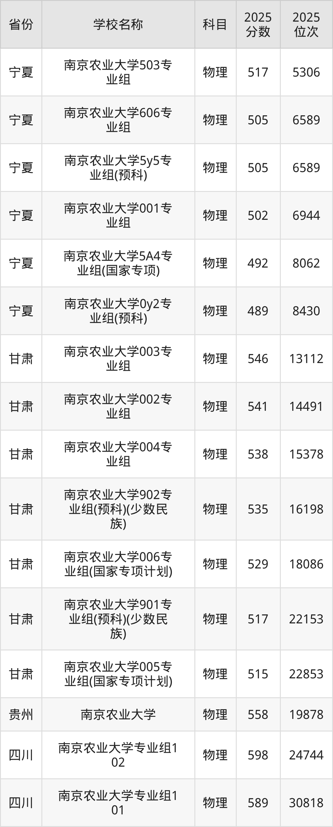 南京农业大学2025年有5个专业组面向江苏省内首选了物理科目的考生招生: