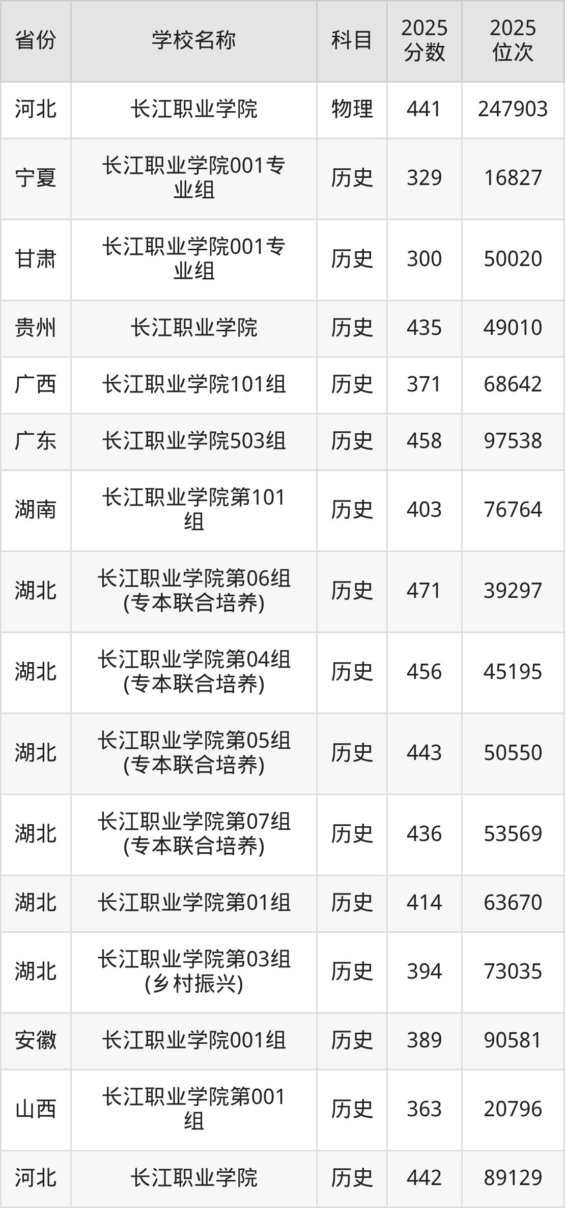 再看湖北高考2025年专科批次线,历史类是200分、物理类是200分。通过对比发现:长江职业学院2025年历史类最低分比专科线高194分,物理类最低分比专科线高162分。2026届湖北高考生,可通过每一次模考划线,来判断自己的成绩是否有机会被长江职业学院录取。
