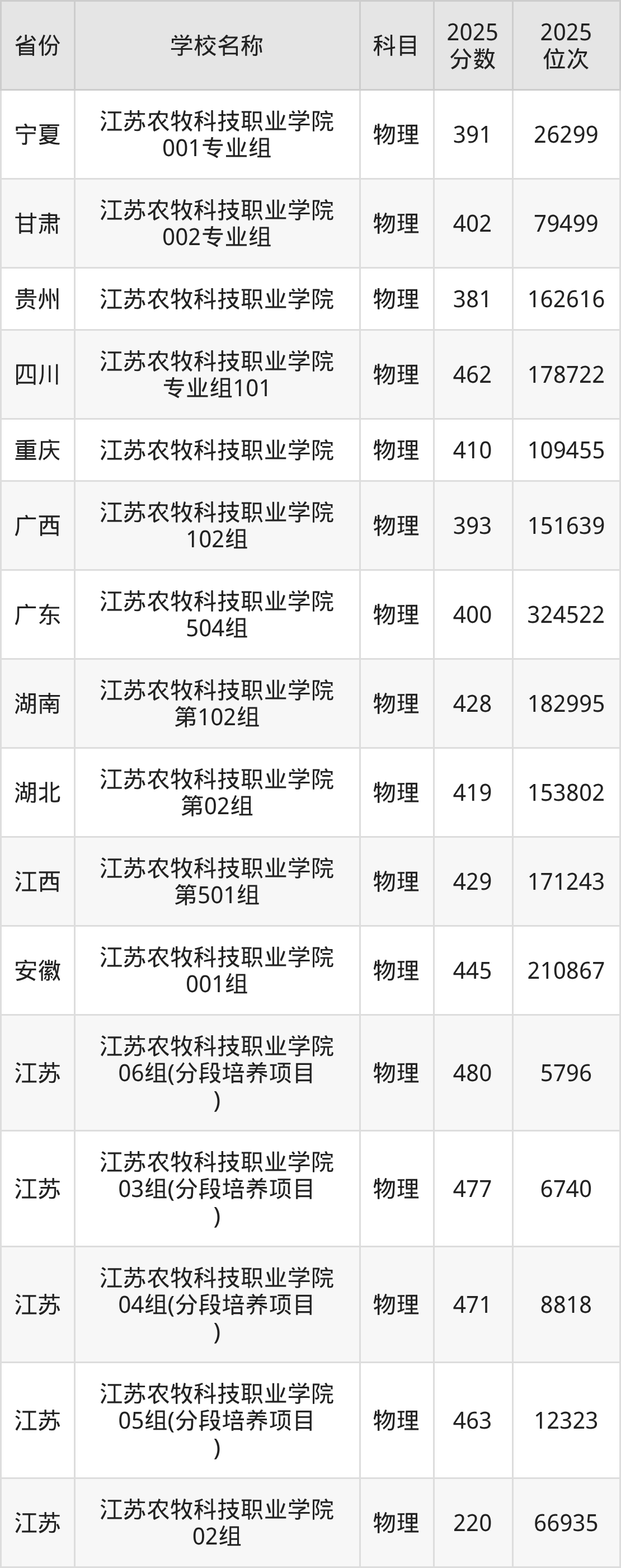 江苏农牧科技职业学院2025年有5个专业组面向江苏省内首选了物理科目的考生招生: