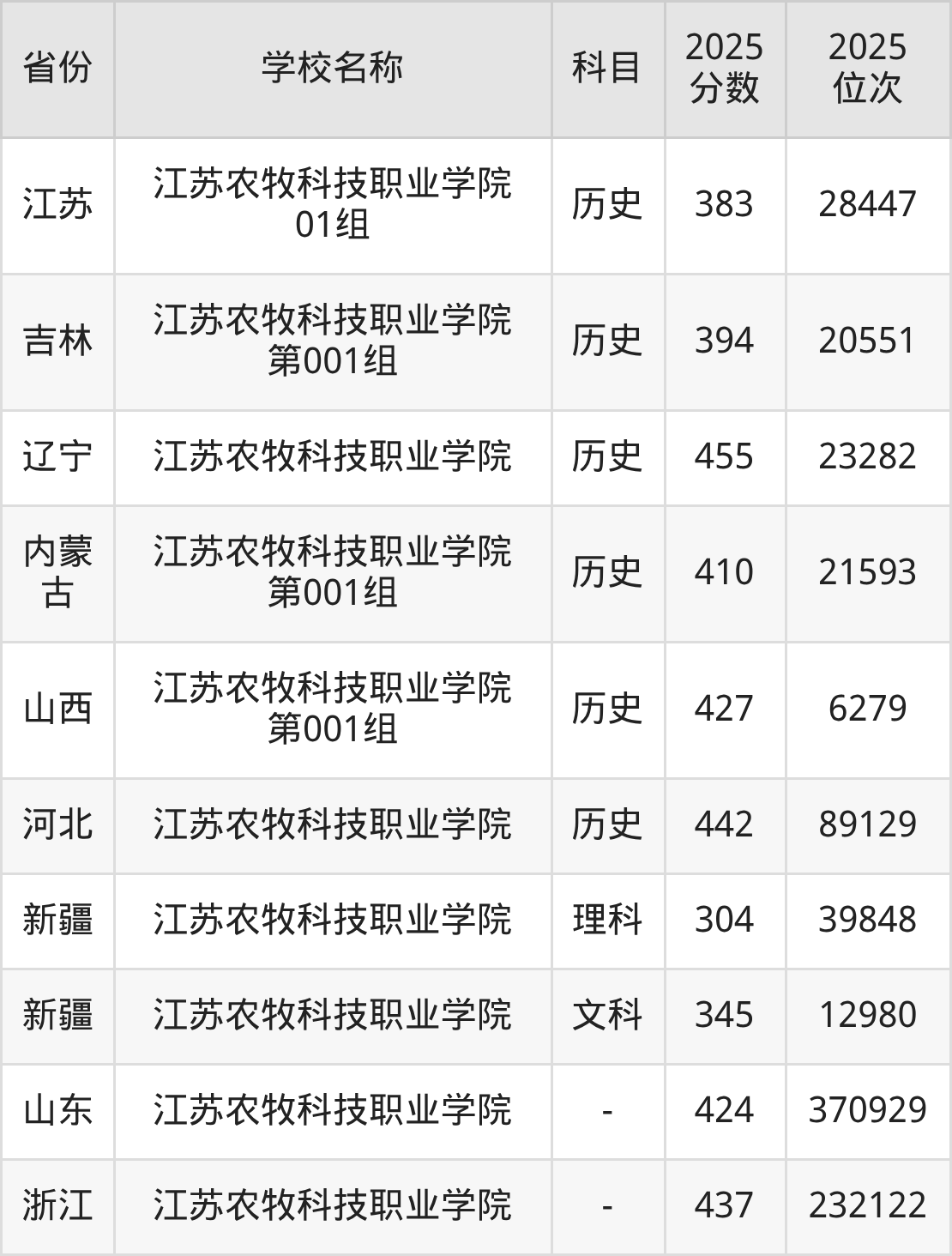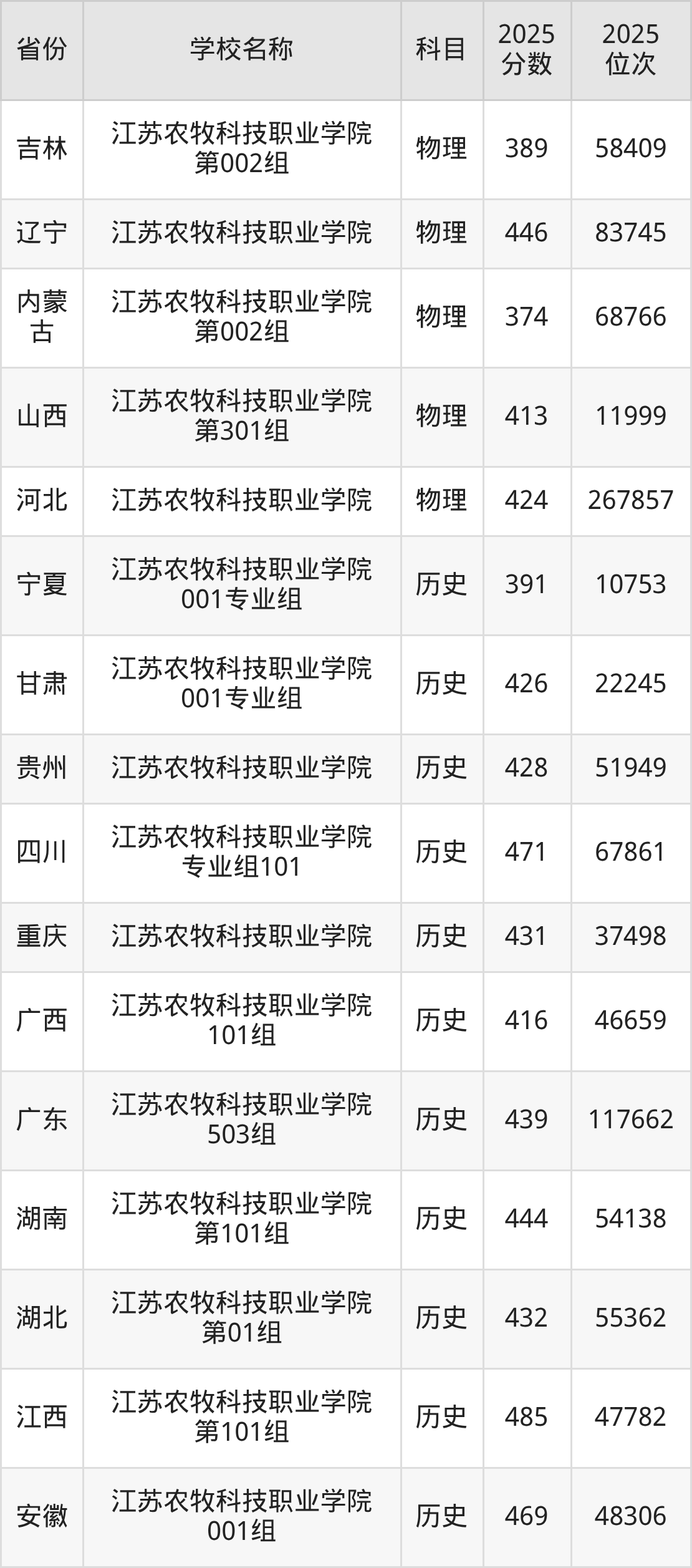 再看江苏高考2025年专科批次线,历史类是220分、物理类是220分。通过对比发现:江苏农牧科技职业学院2025年历史类最低分比专科线高163分,物理类最低分与专科线相等。2026届江苏高考生,可通过每一次模考划线,来判断自己的成绩是否有机会被江苏农牧科技职业学院录取。