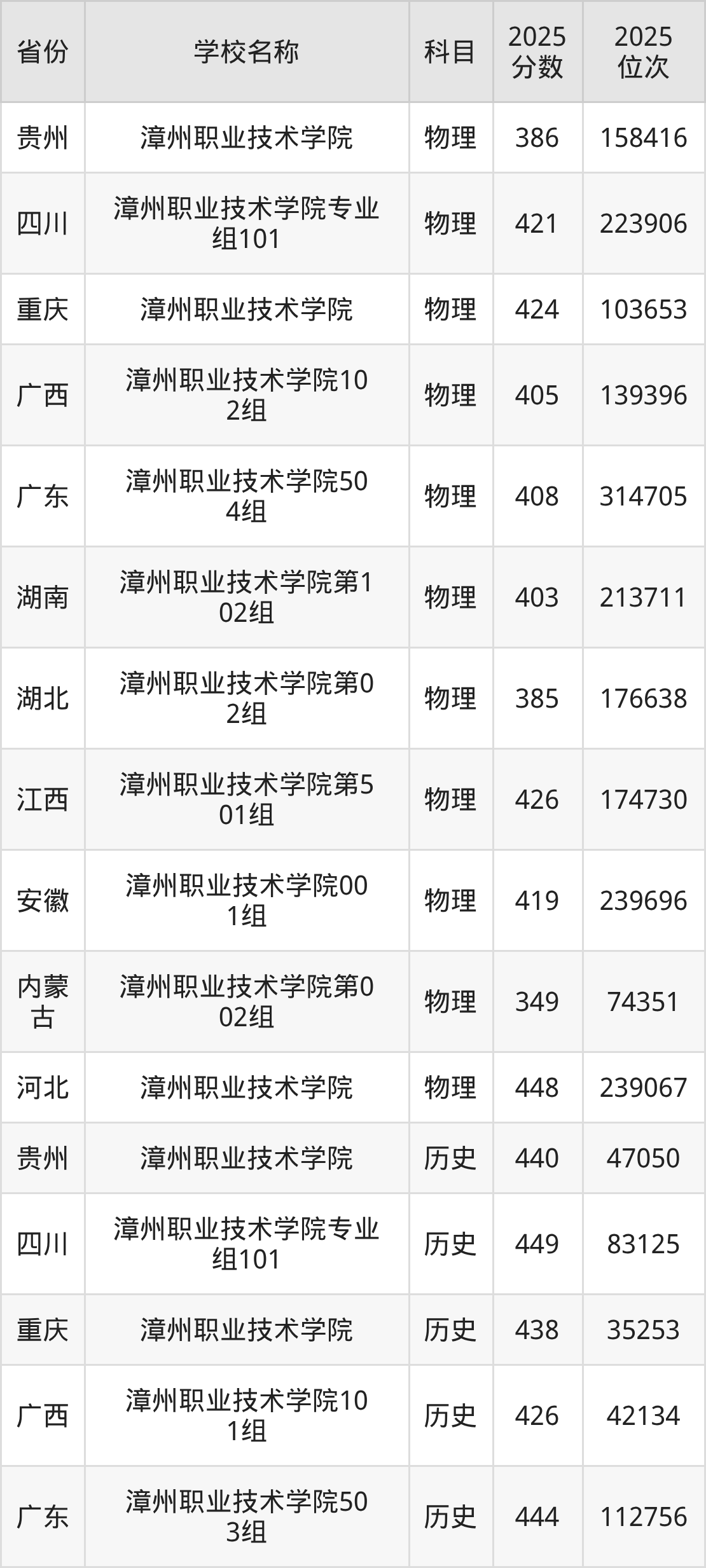 2025年漳州职业技术学院在全国各省专科的最低录取分数线在261~486分之间。河北物理类高考生最低448分能上漳州职业技术学院、江西物理类高考生最低426分能上漳州职业技术学院……下文将展示漳州职业技术学院在全国12个高考省份中的专科最低投档录取分汇总!