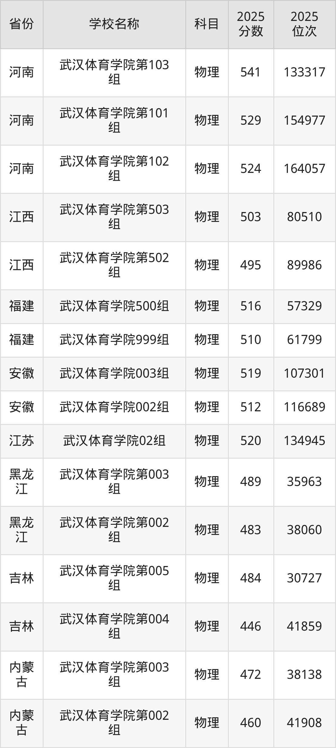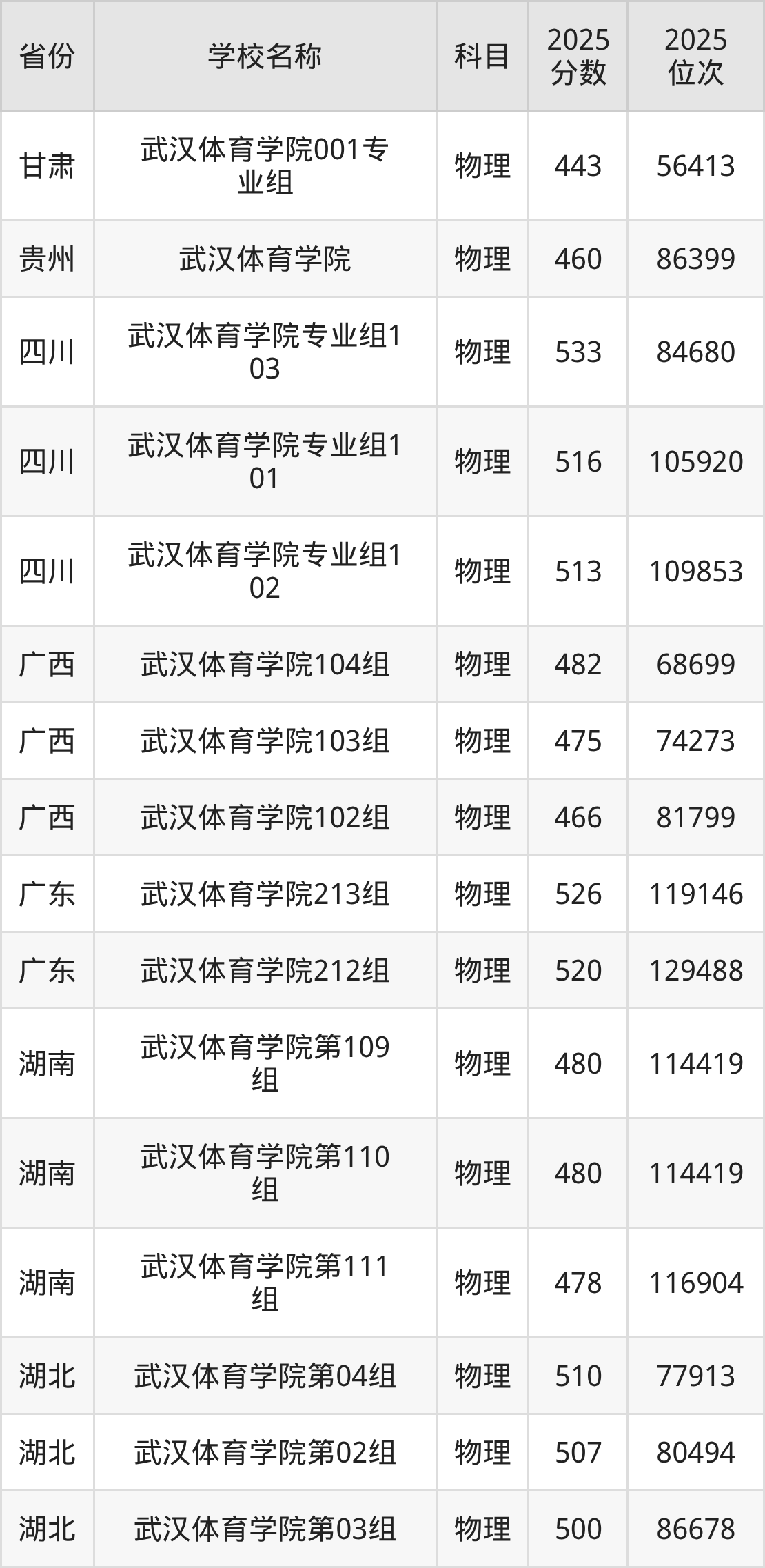 武汉体育学院2025年有3个专业组面向湖北省内首选了物理科目的考生招生: