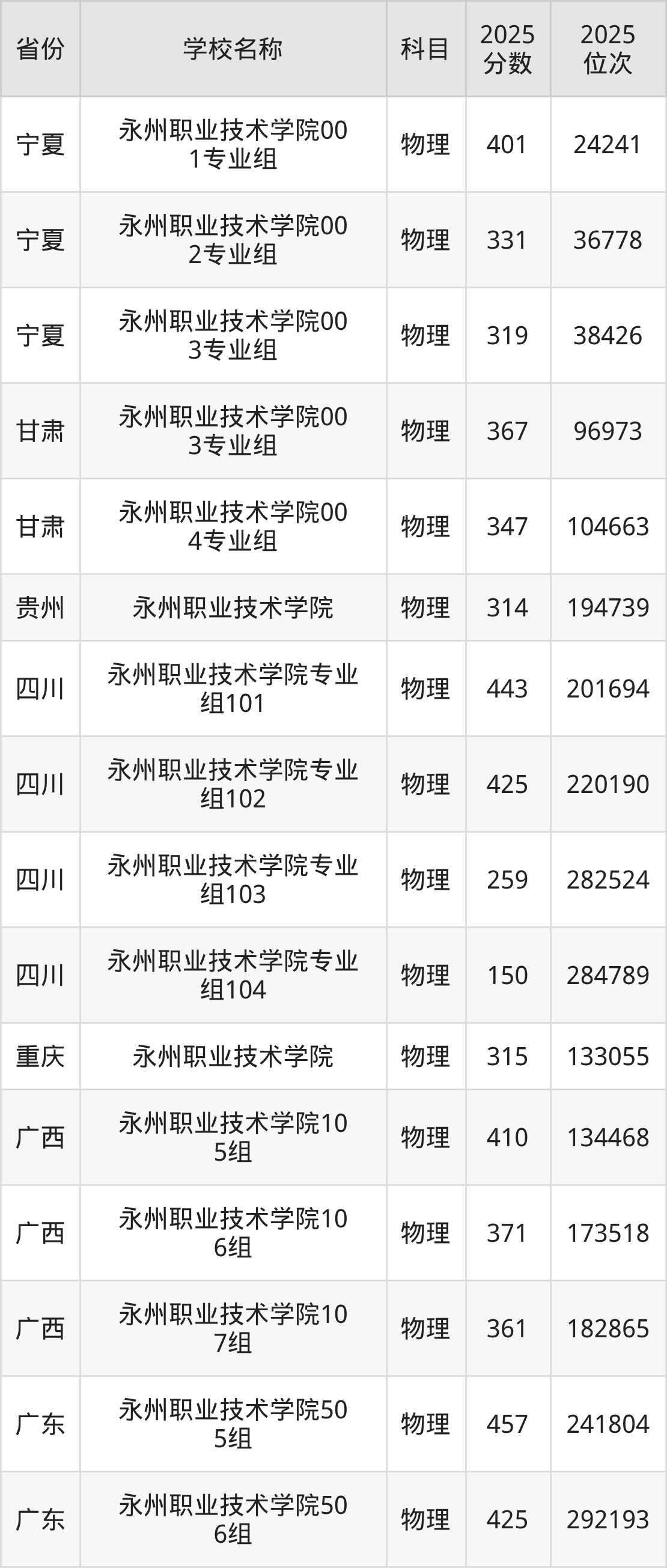 2025年永州职业技术学院在全国各省专科的最低录取分数线在150~498分之间。浙江高考生最低483分能上永州职业技术学院、江西物理类高考生最低460分能上永州职业技术学院……下文将展示永州职业技术学院在全国15个高考省份中的专科最低投档录取分汇总!