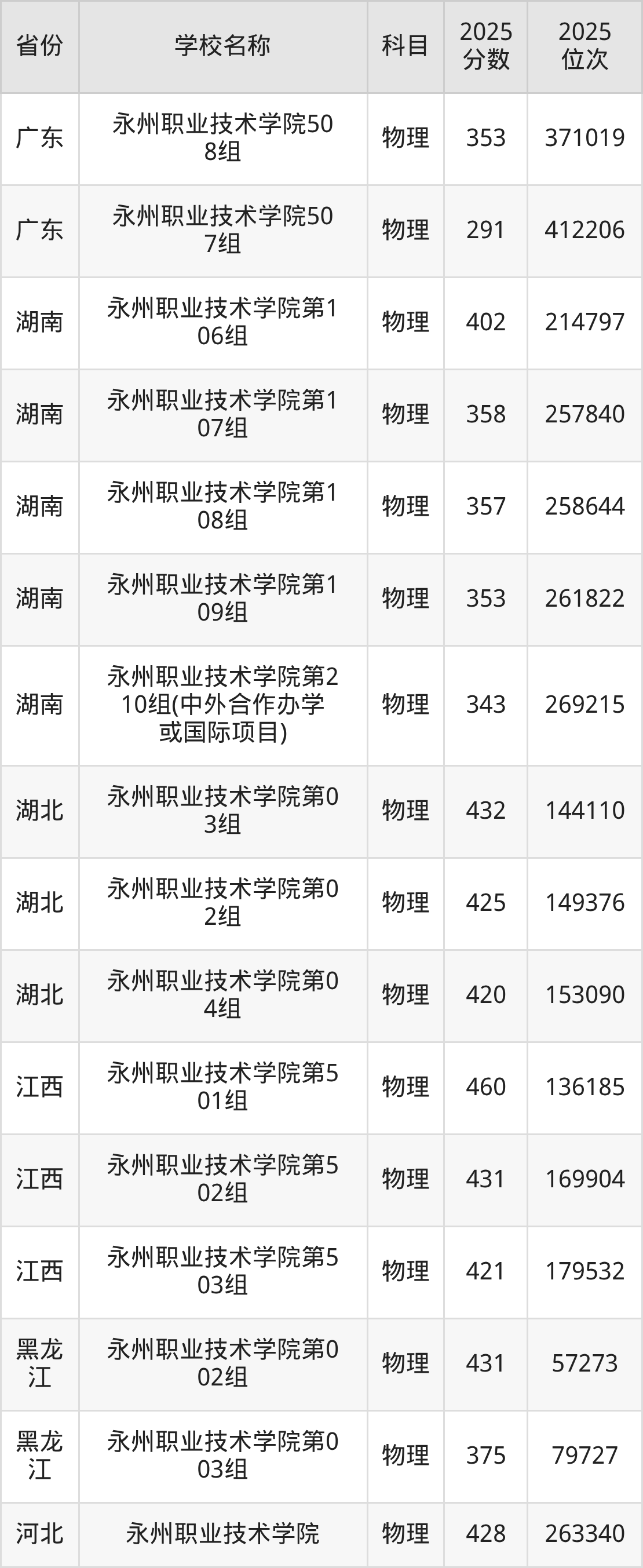 永州职业技术学院2025年有5个专业组面向湖南省内首选了物理科目的考生招生: