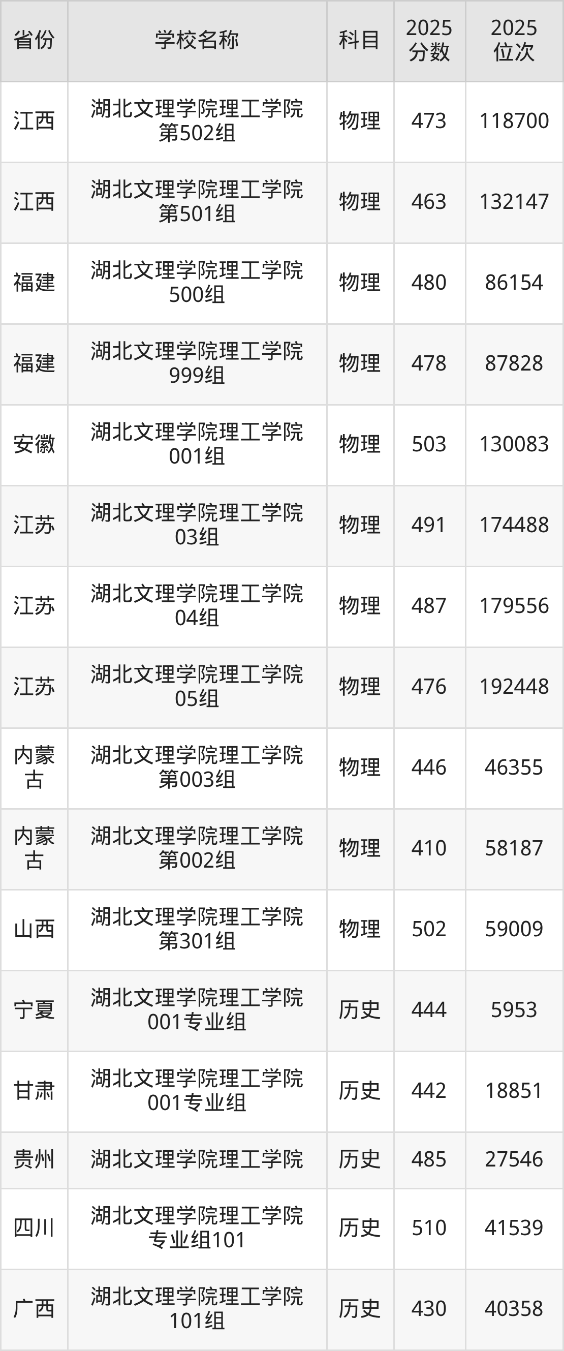 二、湖北文理学院理工学院各专业录取分数线