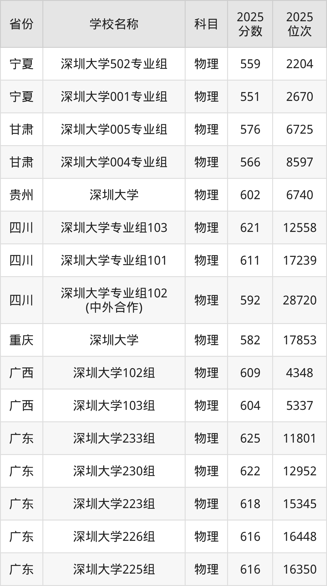 二、深圳大学各专业录取分数线