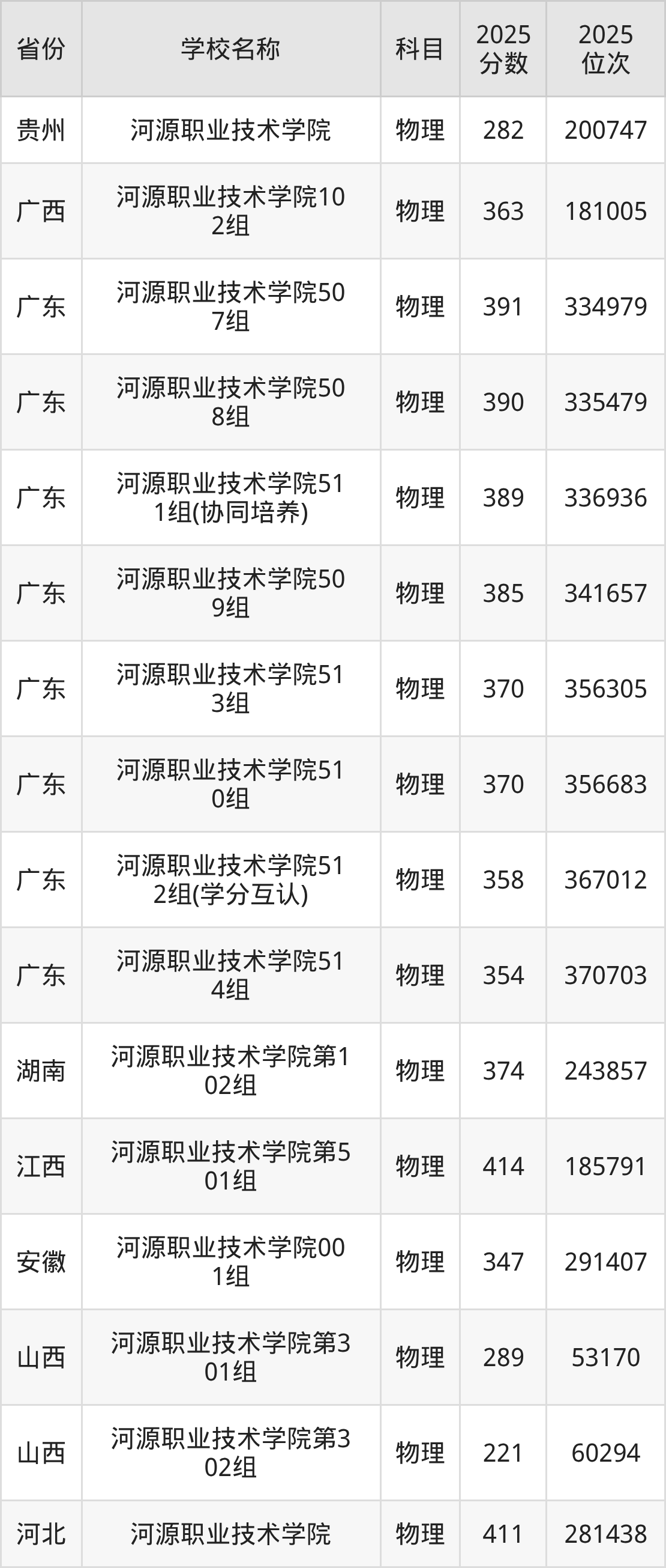 2025年河源职业技术学院在全国各省专科的最低录取分数线在144~474分之间。江西物理类高考生最低414分能上河源职业技术学院、河北物理类高考生最低411分能上河源职业技术学院……下文将展示河源职业技术学院在全国9个高考省份中的专科最低投档录取分汇总!