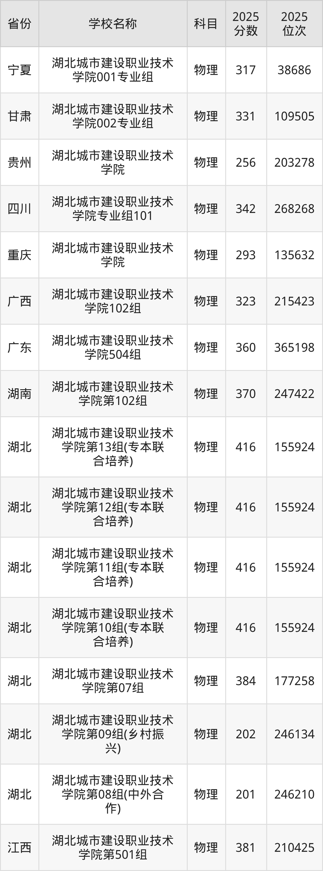 湖北城市建设职业技术学院2025年有7个专业组面向湖北省内首选了物理科目的考生招生: