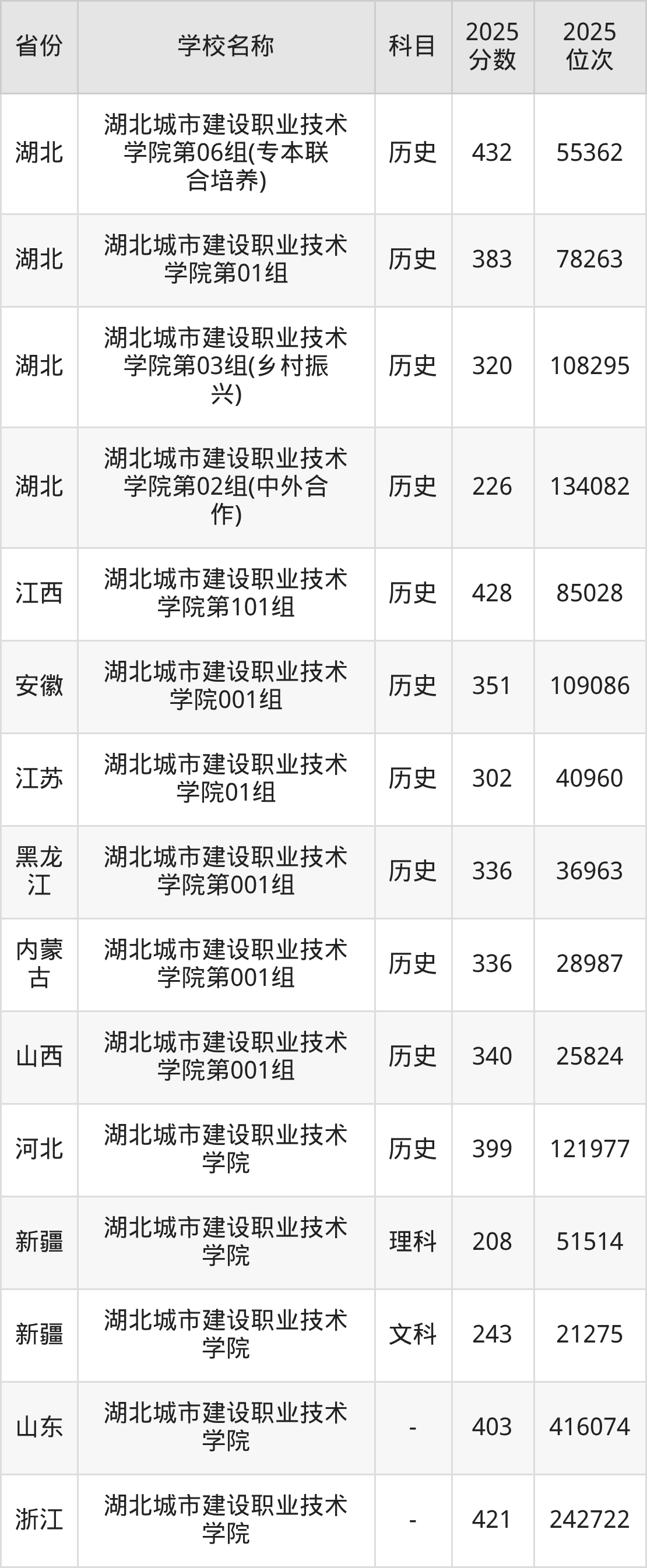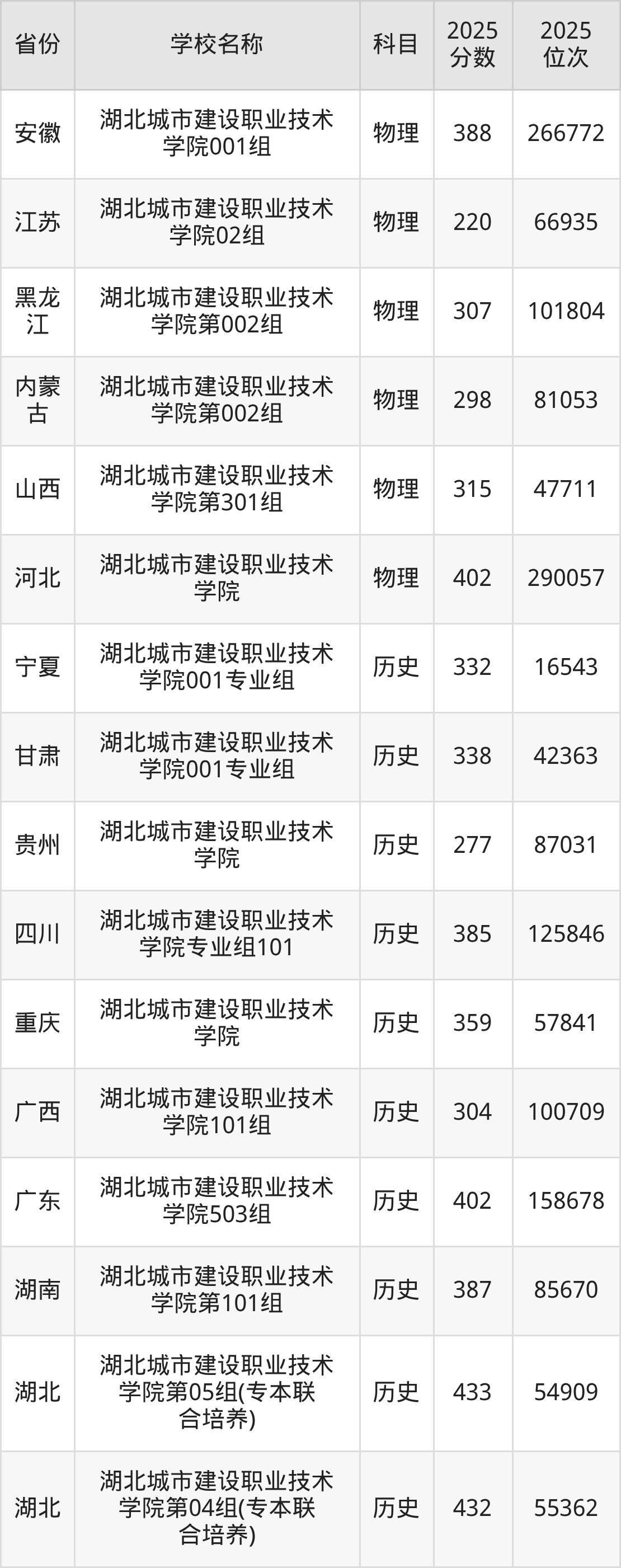 2025年湖北城市建设职业技术学院在全国各省专科的最低录取分数线在201~433分之间。浙江高考生最低421分能上湖北城市建设职业技术学院、湖北物理类高考生最低416分能上湖北城市建设职业技术学院……下文将展示湖北城市建设职业技术学院在全国19个高考省份中的专科最低投档录取分汇总!