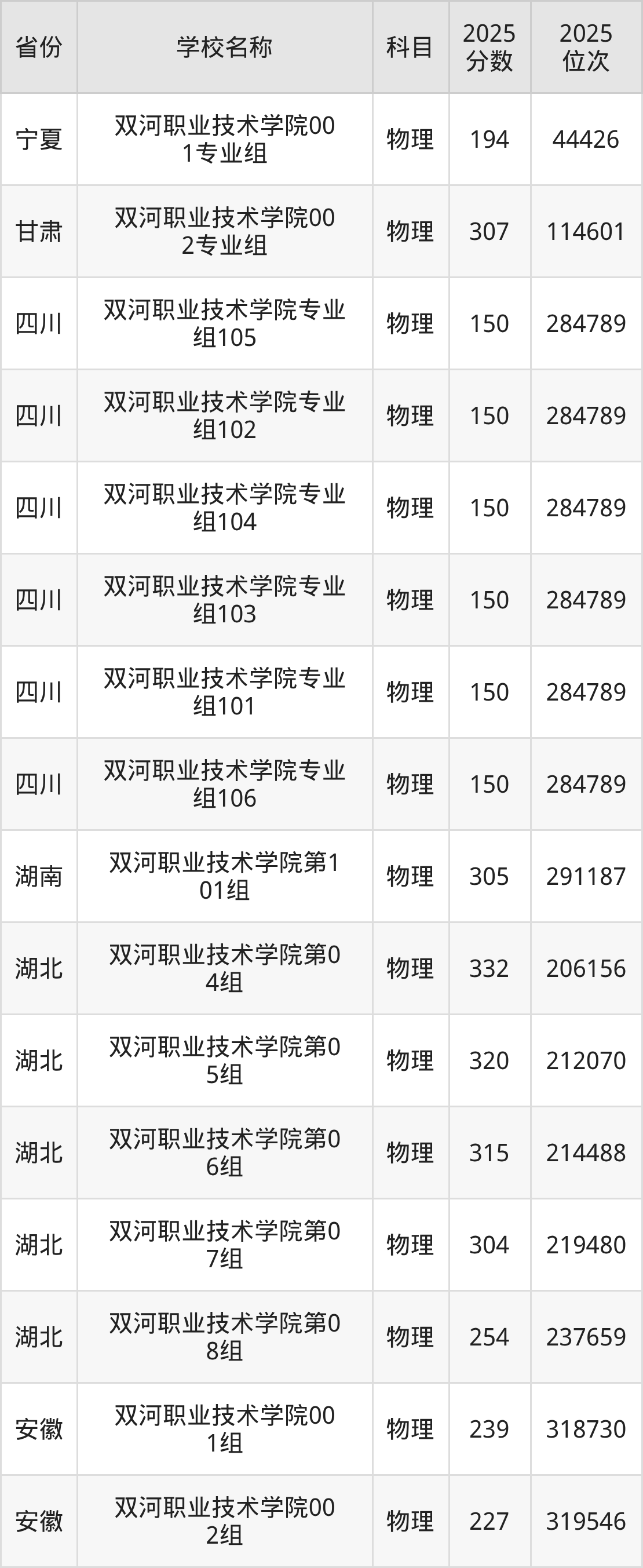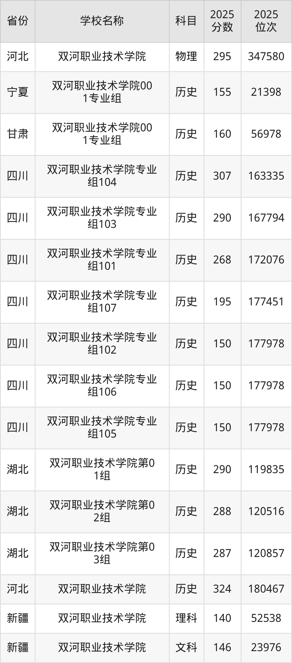 二、双河职业技术学院各专业录取分数线