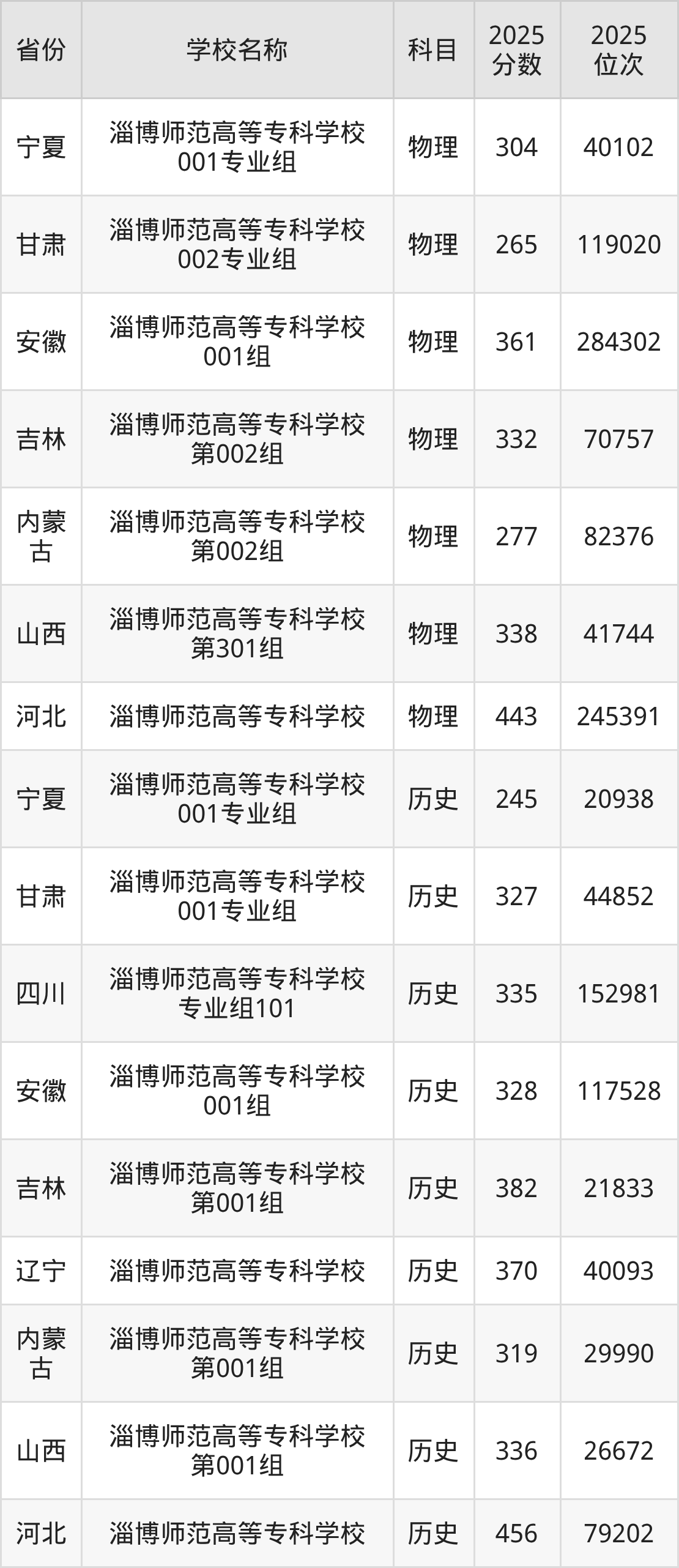 2025年淄博师范高等专科学校在全国各省专科的最低录取分数线在245~456分之间。河北物理类高考生最低443分能上淄博师范高等专科学校、辽宁历史类高考生最低370分能上淄博师范高等专科学校……下文将展示淄博师范高等专科学校在全国10个高考省份中的专科最低投档录取分汇总!