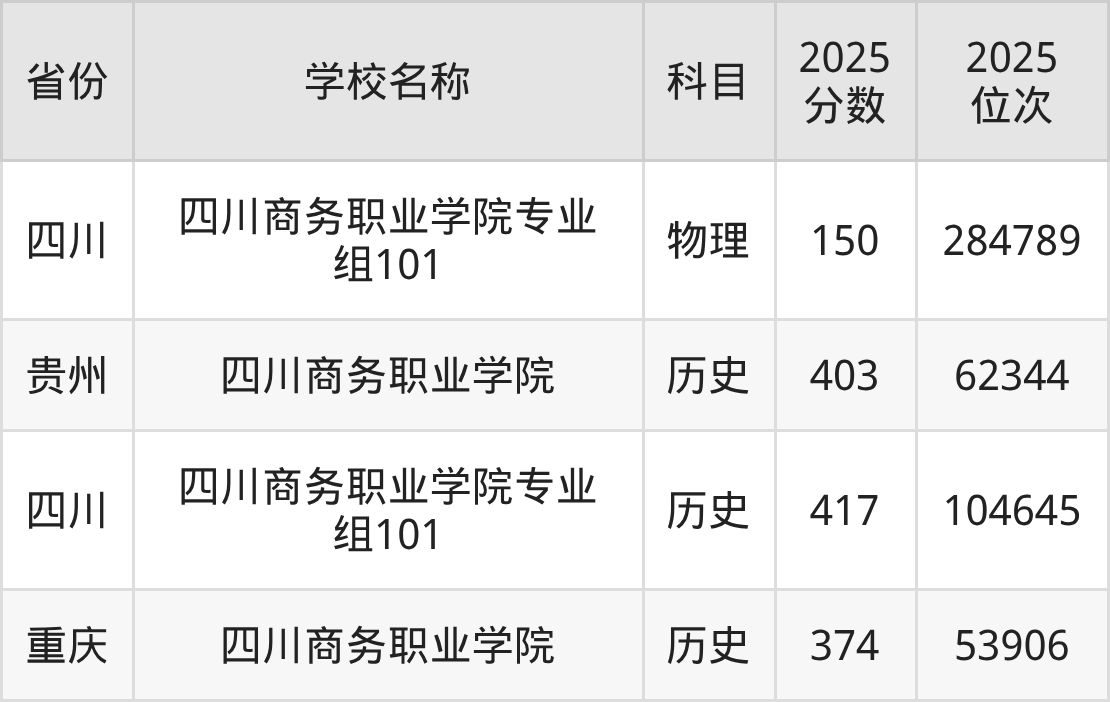 再看四川高考2025年专科批次线,历史类是150分、物理类是150分。通过对比发现:四川商务职业学院2025年历史类最低分比专科线高267分,物理类最低分与专科线相等。2026届四川高考生,可通过每一次模考划线,来判断自己的成绩是否有机会被四川商务职业学院录取。