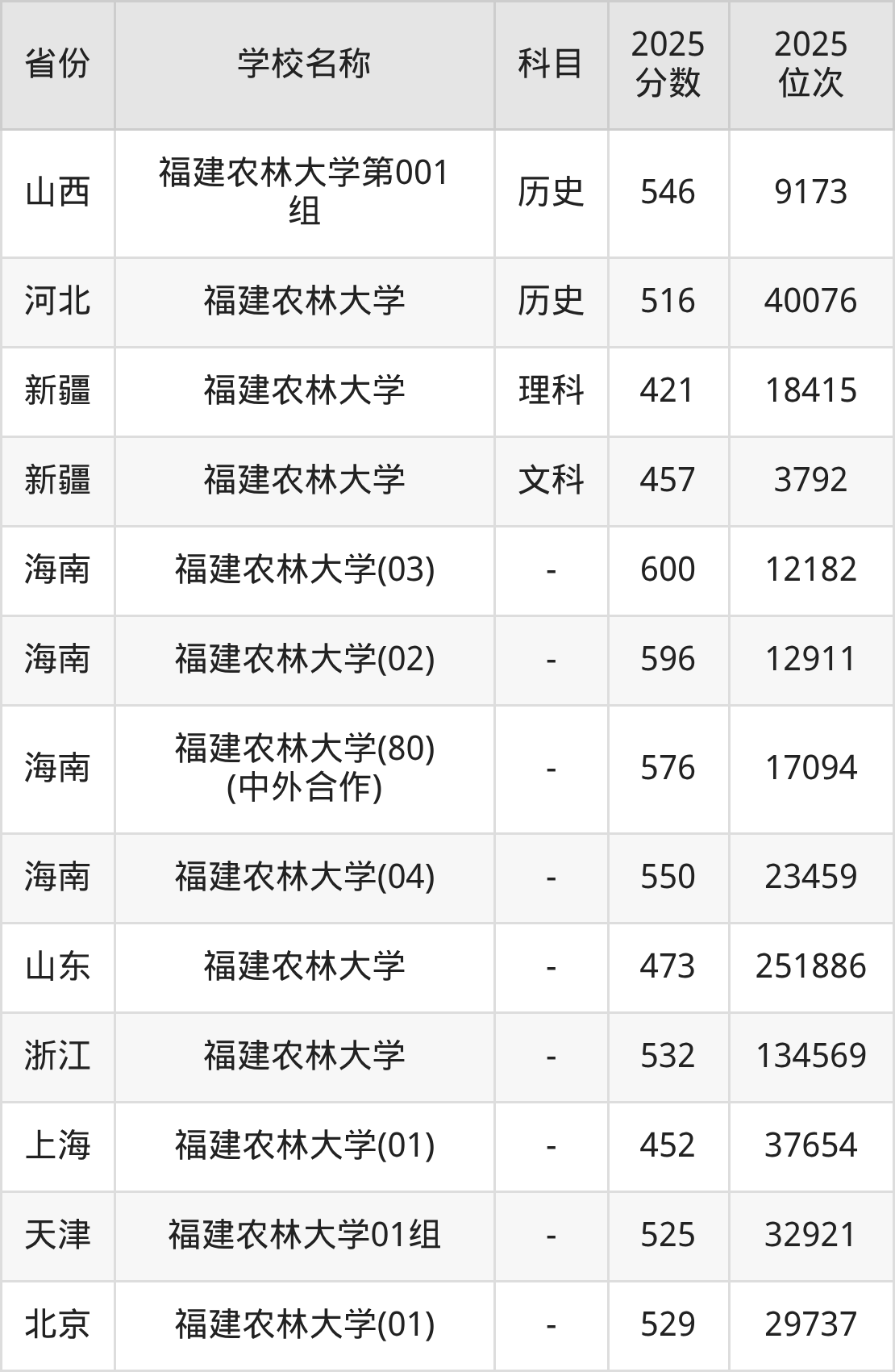 二、福建农林大学各专业录取分数线