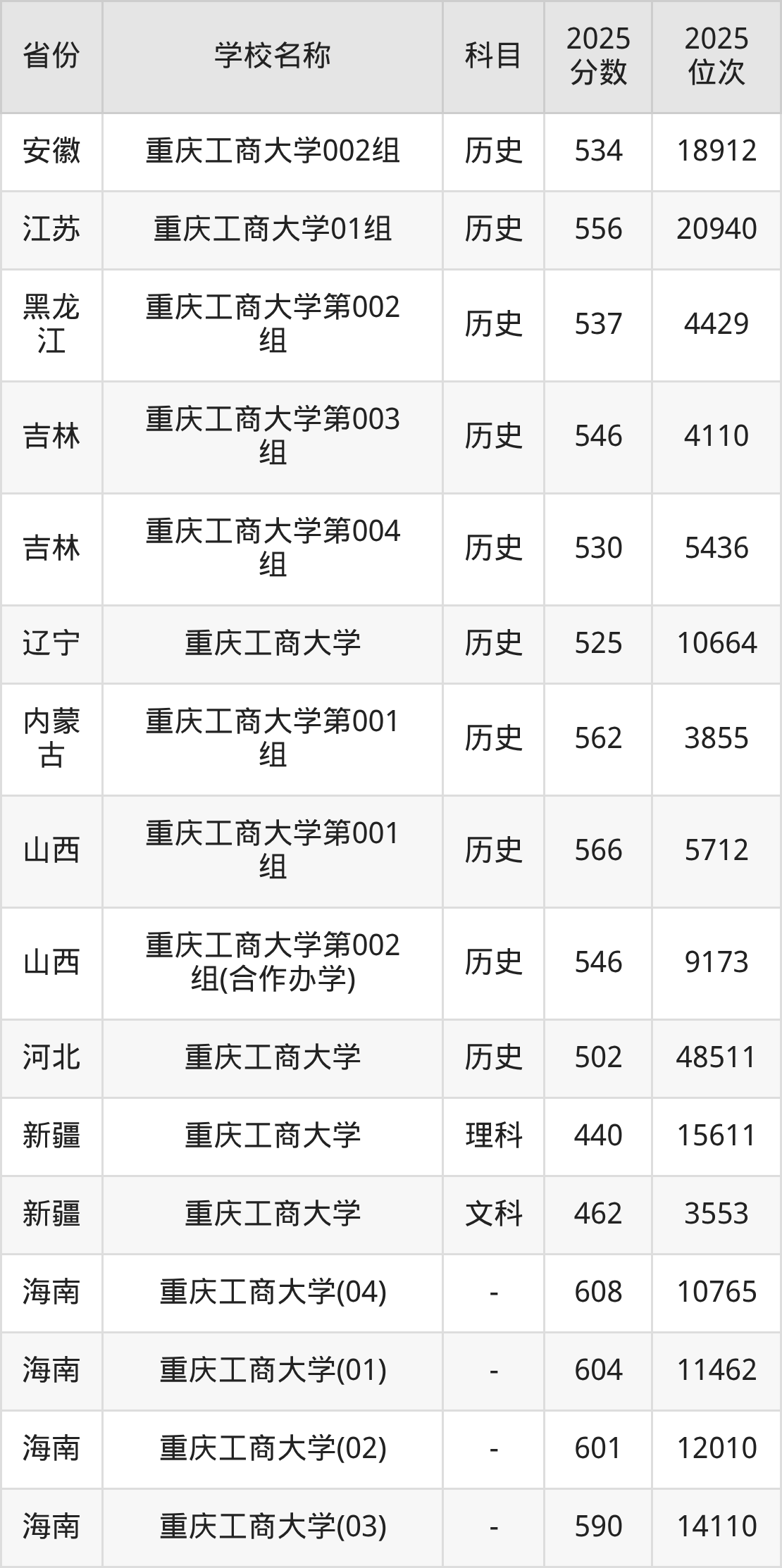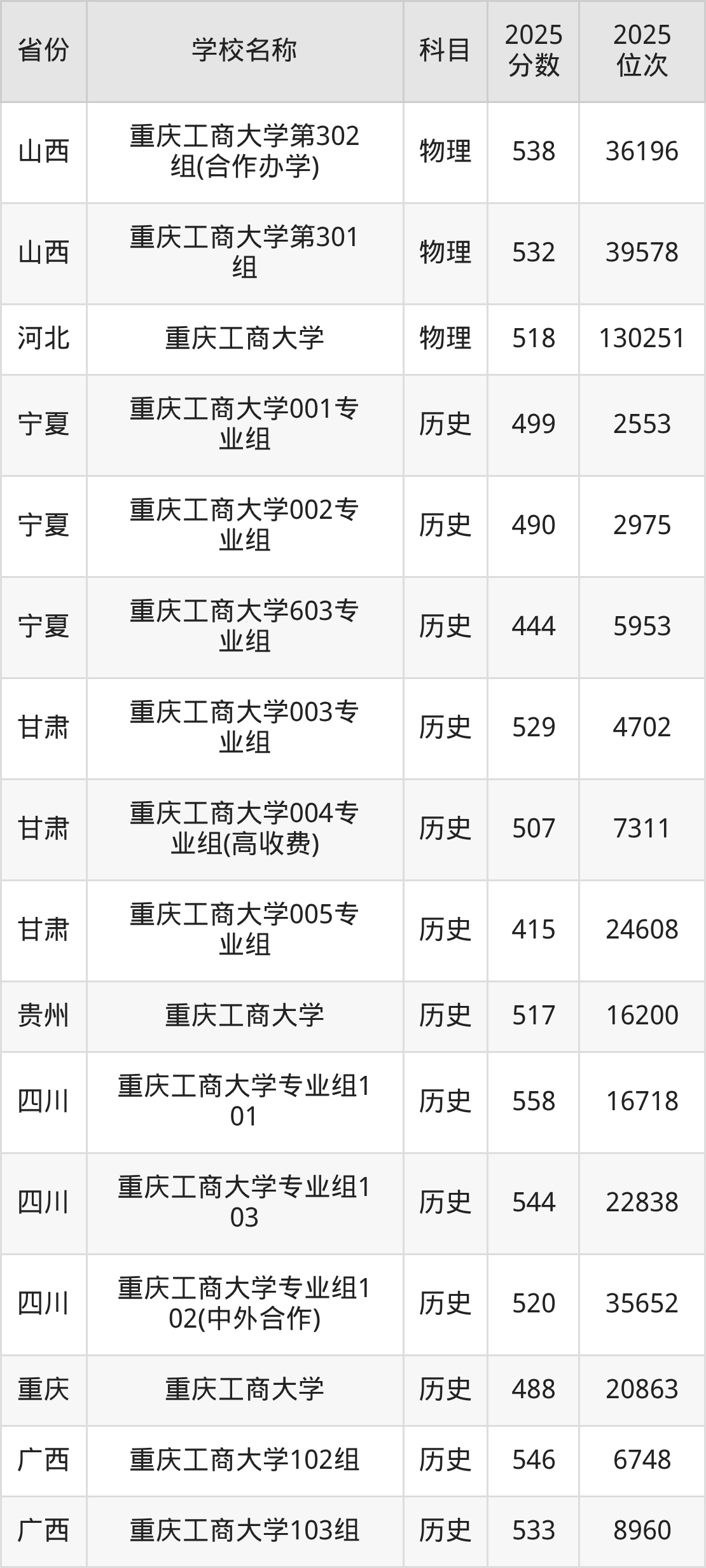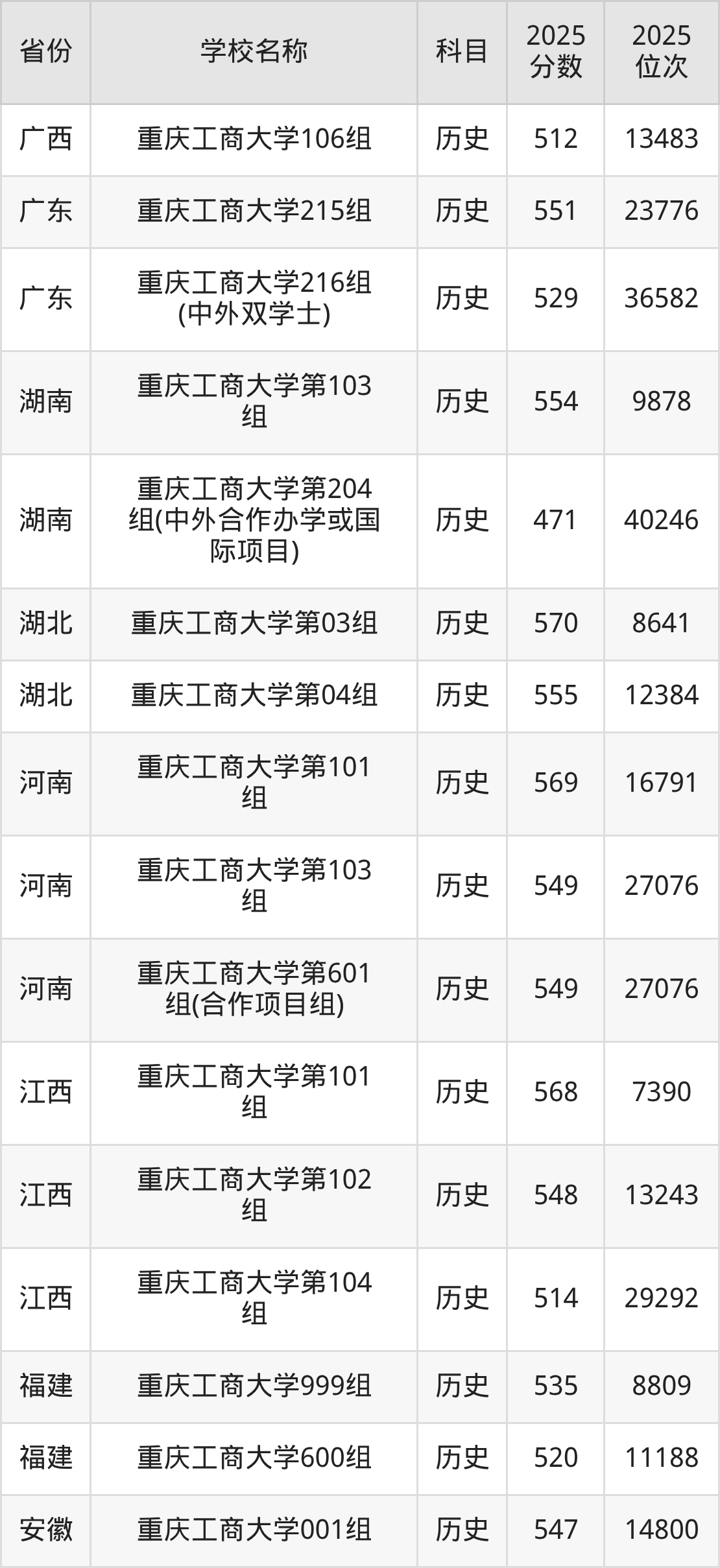 二、重庆工商大学各专业录取分数线