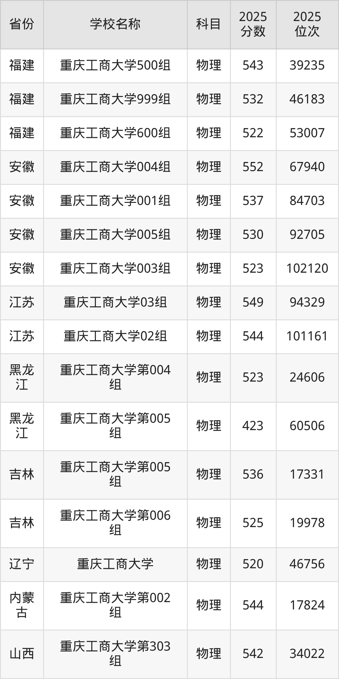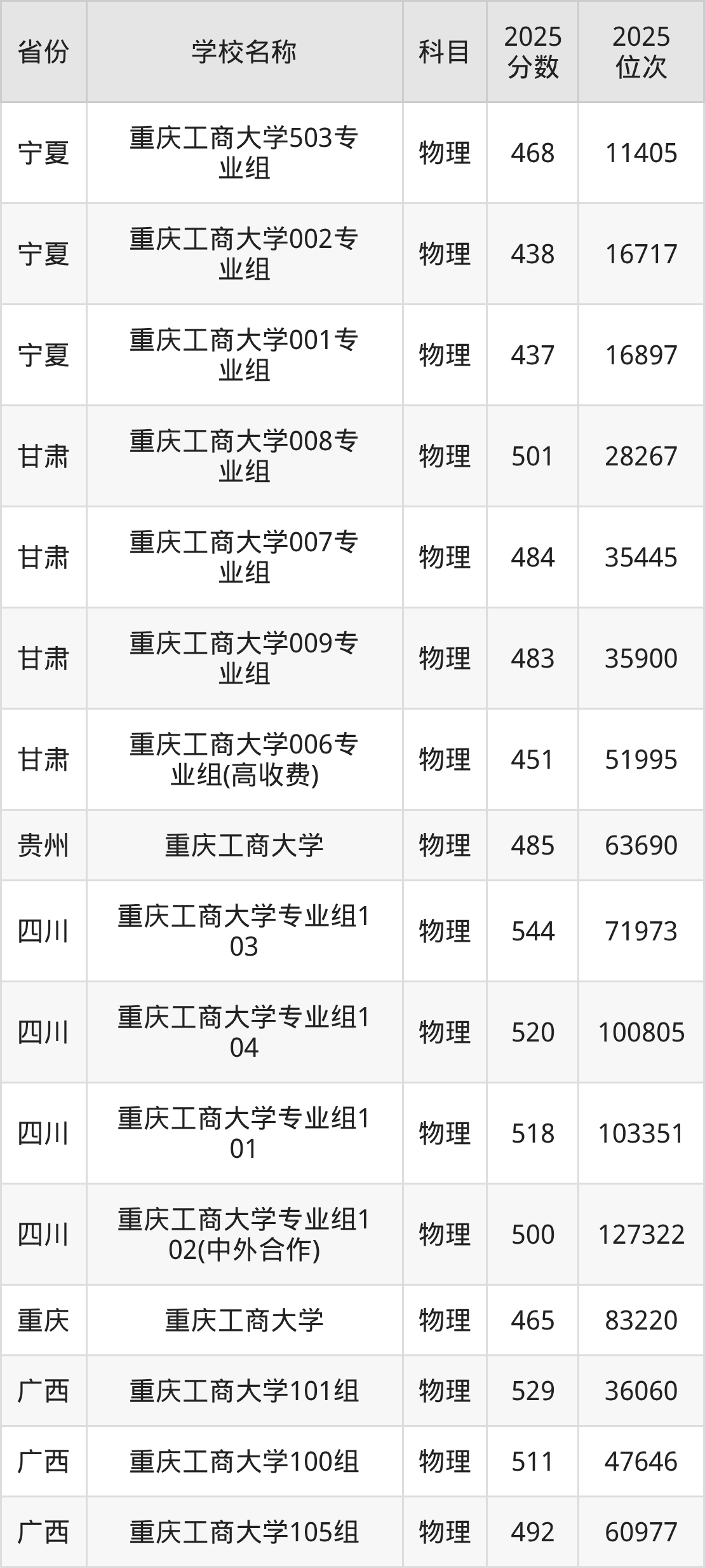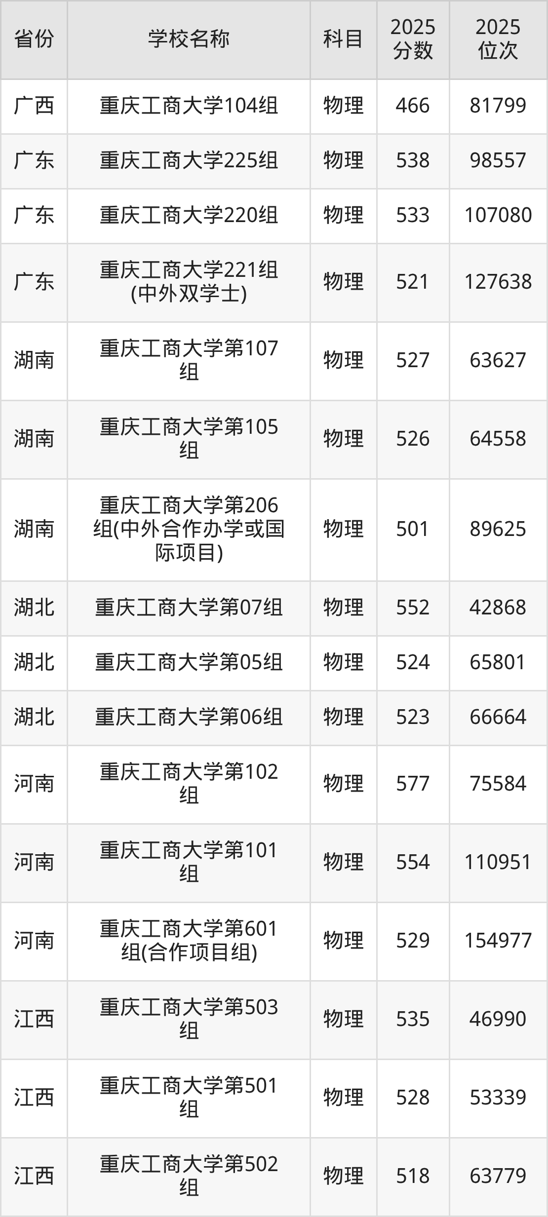 二、重庆工商大学各专业录取分数线