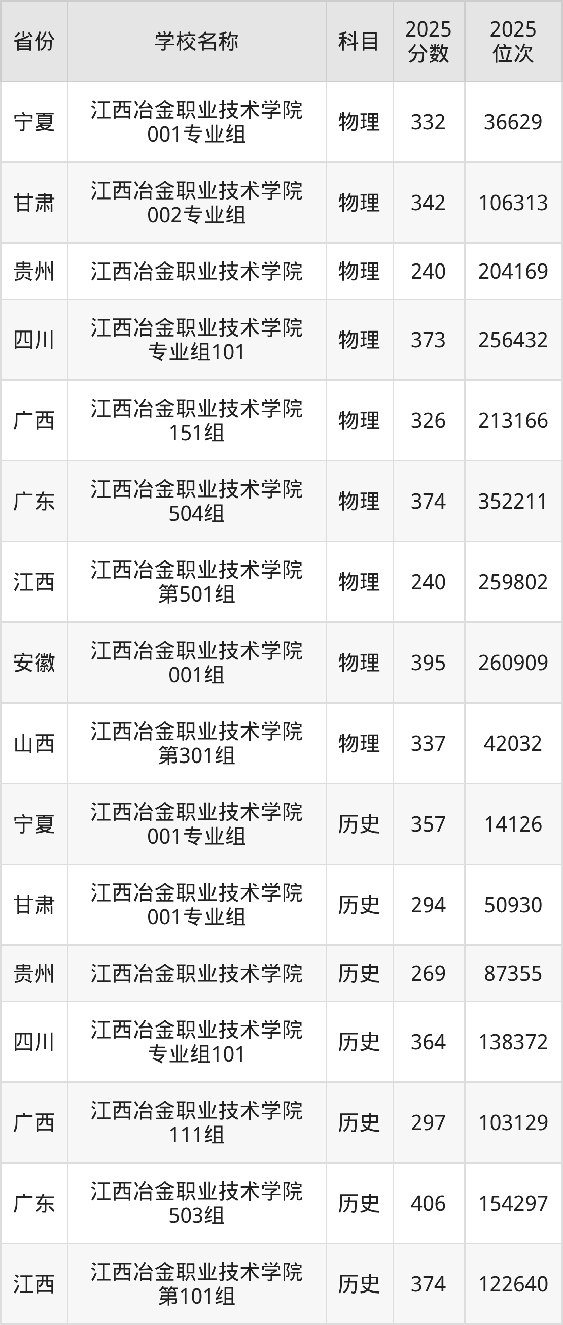 二、江西冶金职业技术学院各专业录取分数线