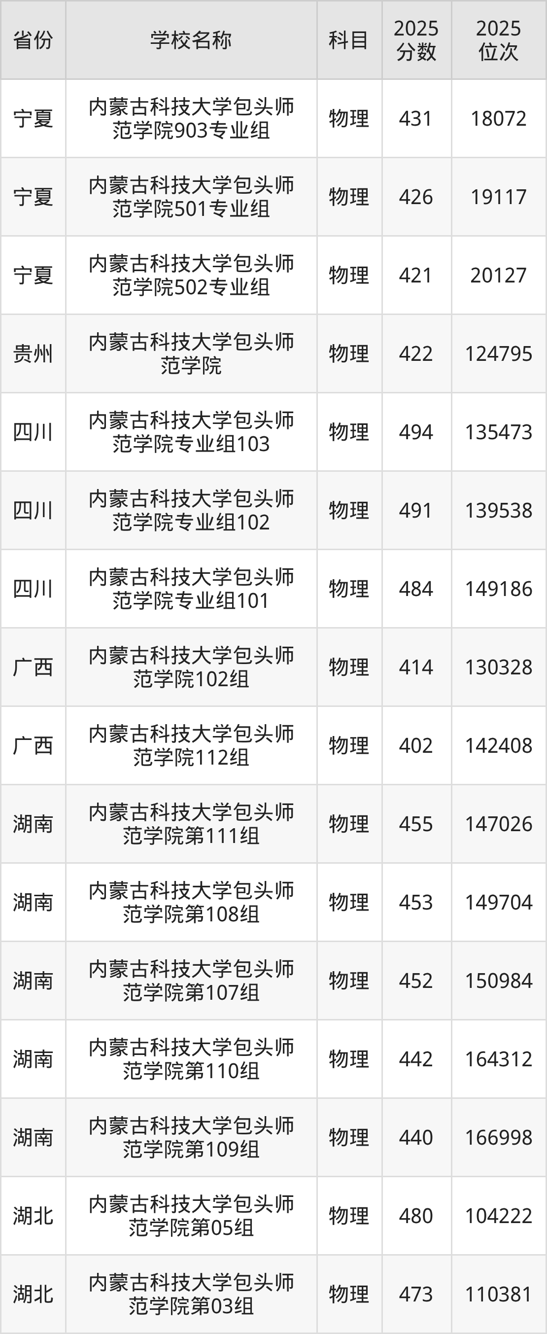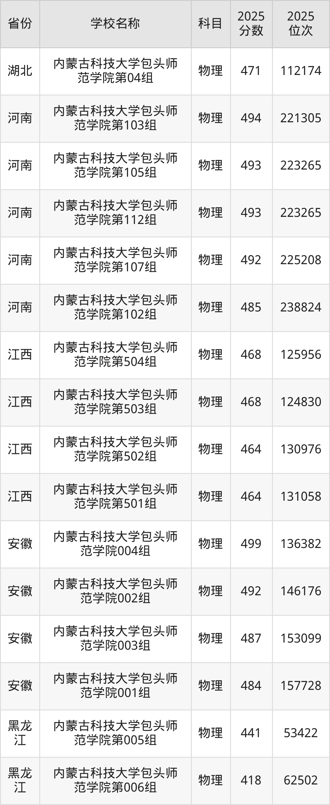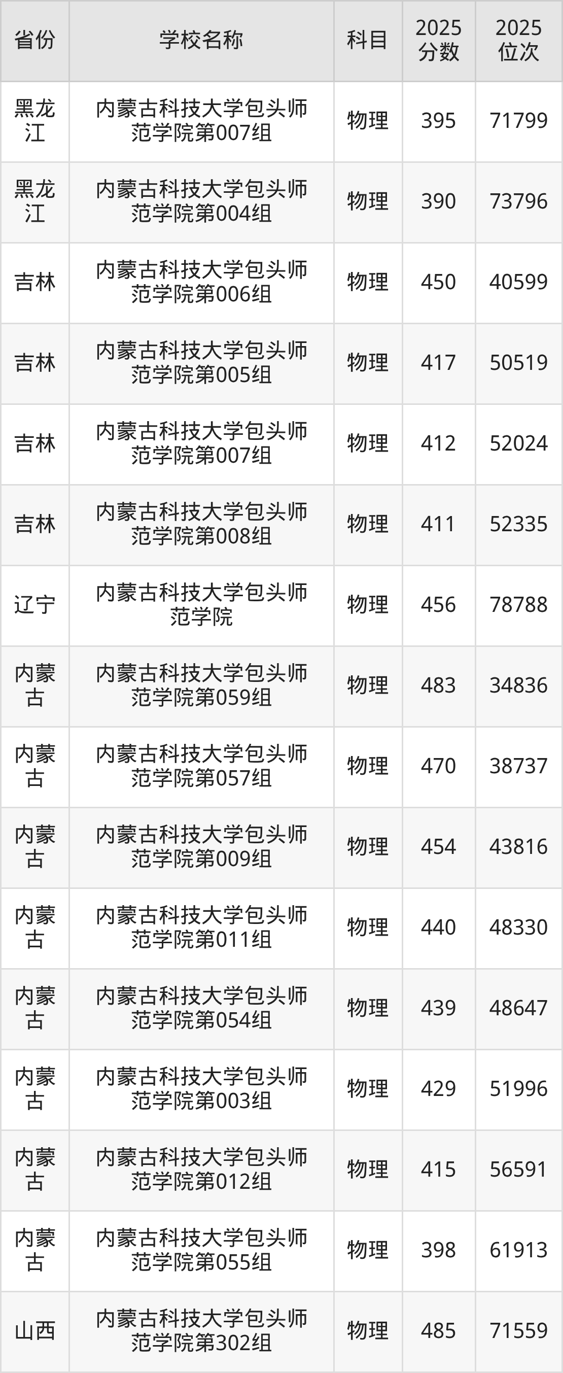 内蒙古科技大学包头师范学院2025年有12个专业组面向内蒙古自治区内首选了物理科目的考生招生: