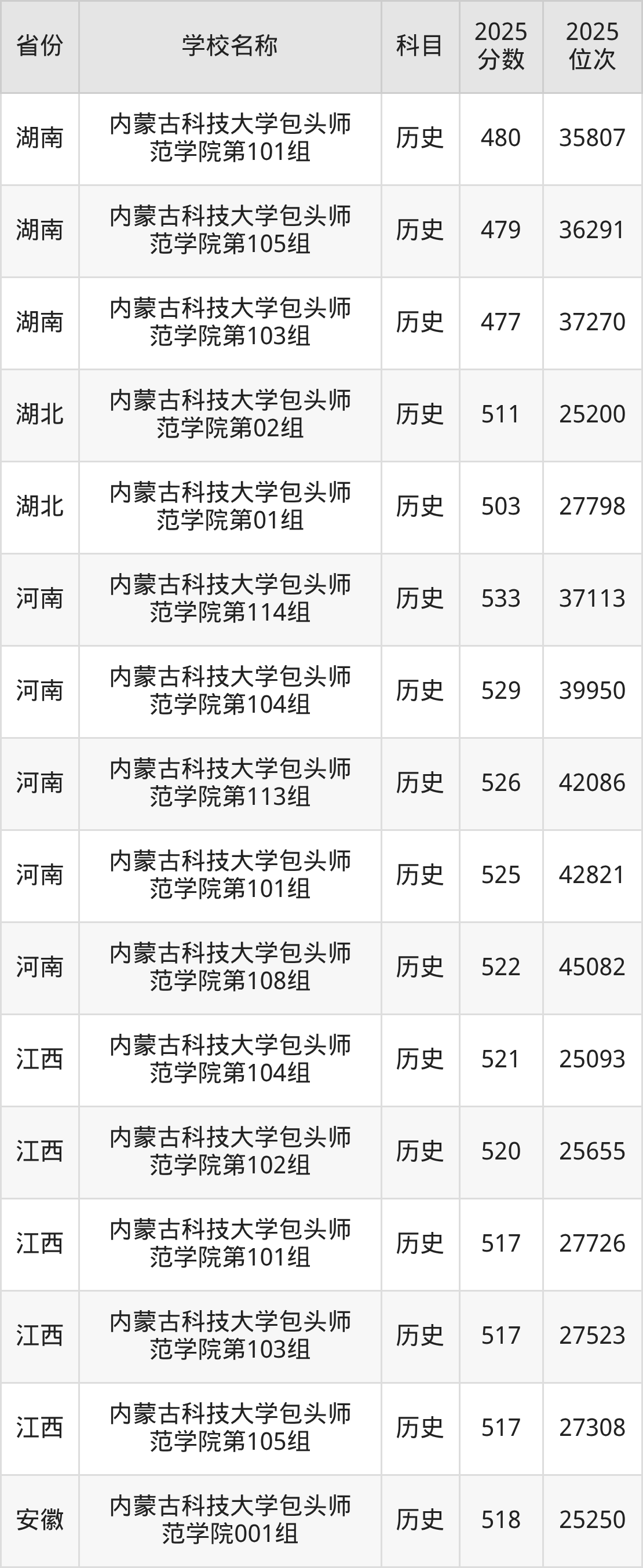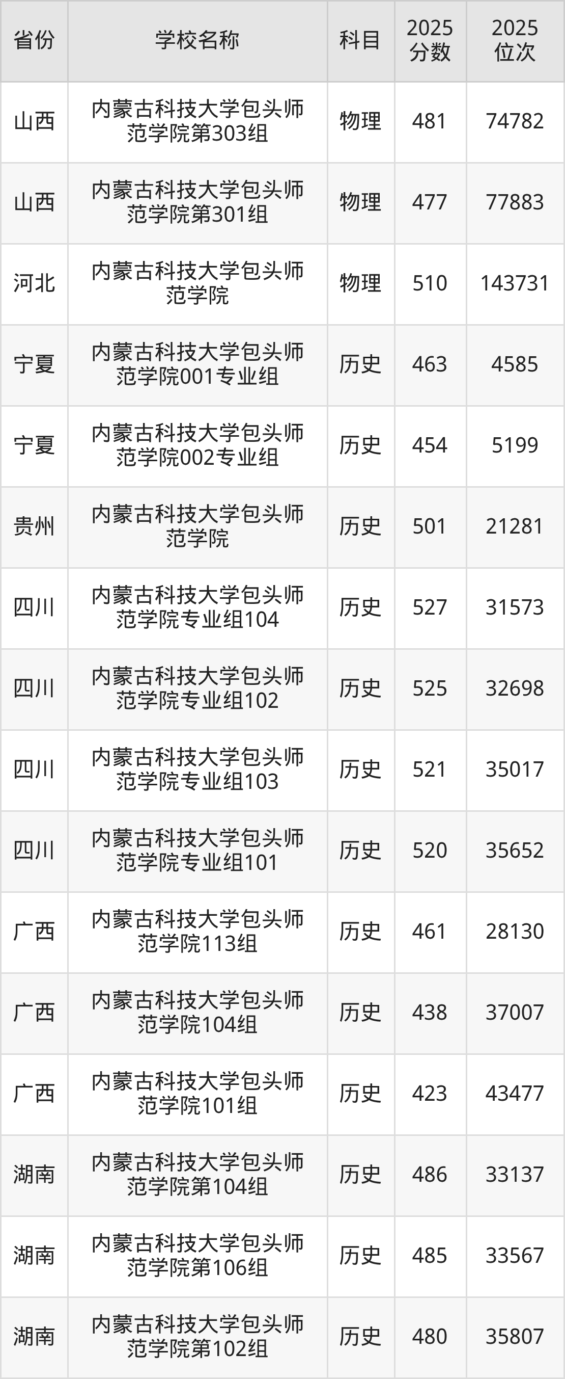 二、内蒙古科技大学包头师范学院各专业录取分数线