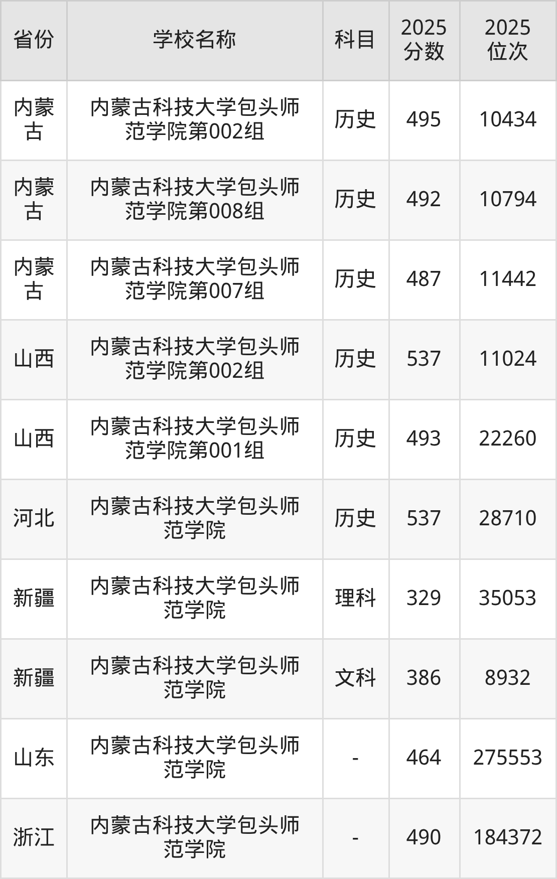 一、2025内蒙古科技大学包头师范学院录取分数线